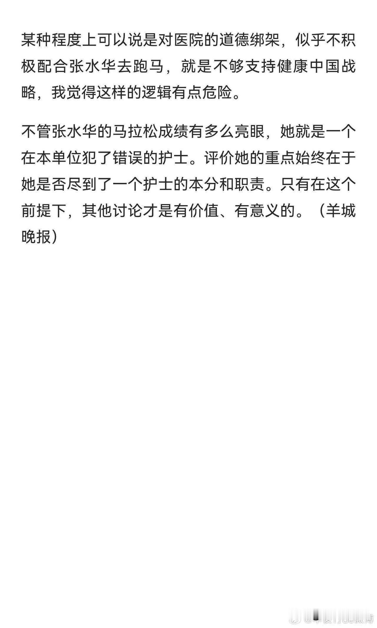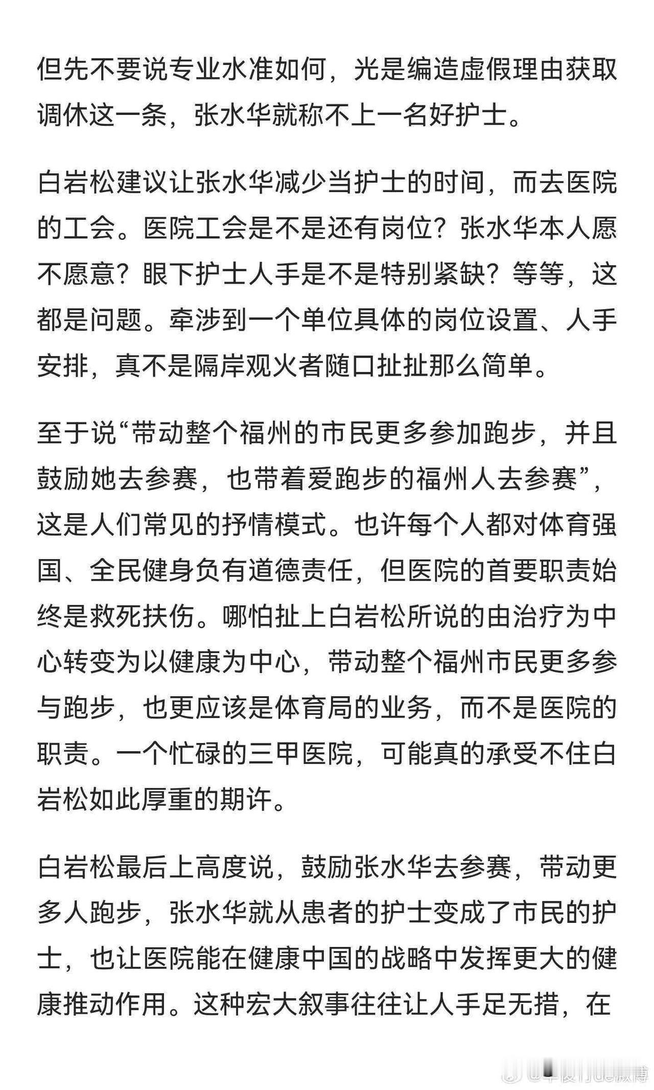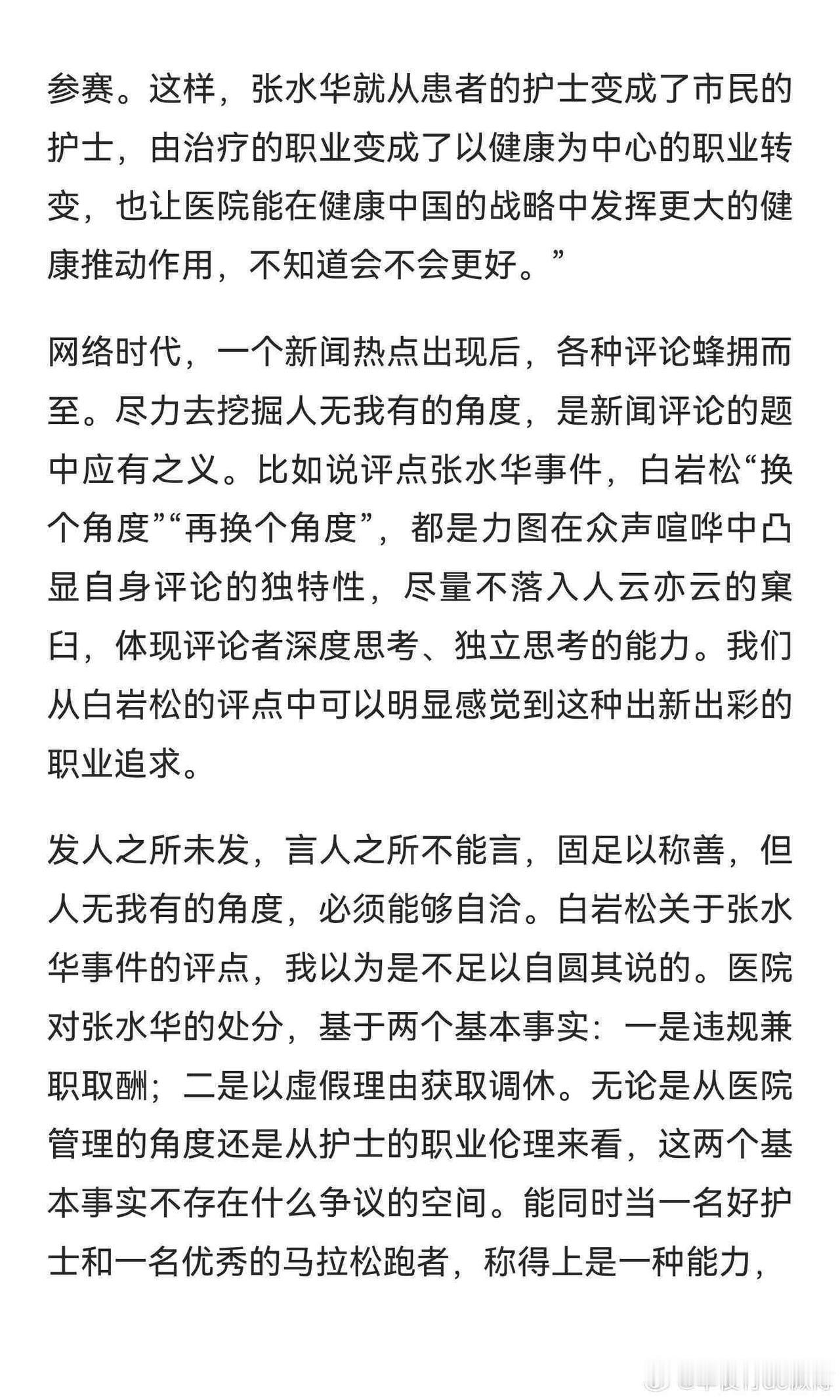 羊城晚报评白岩松:他对最快女护士张水华的评点不能自圆其说,仔细想想,你同意羊城晚报的观点,还是白岩松的观点。 羊城晚报认为, 医院对于张水华的处分,基于两个基本事实:一是违规兼职取酬,二是 以虚假理由获得调休。这两个事实是不存在争议的,张水华虽然是一名优秀的跑者,但虚假理由调休这一条,她就不能称为一名好护士。 而白岩松建议让张水华减少当护士的时间,去工会工作一类的话,简直就是异想天开。事情没有那么简单,医院不可能为了一个跑者开特例,吗以后还有很多人有其他爱好,怎么办?都能满足吗? 至于白岩松说的带动医院和整个福州市民去跑步,这是抒情模式。医院是救死扶伤的治疗机构,不是健身机构,带动福州全民跑步是福州体育部门的职责,而不是医院的职责。 张水华不管跑步成绩多亮眼,她始终是一个业余跑者,专业还是护士,怎么做好本职工作才是她应该考虑的。一个工作和爱好都分不清轻重,为了爱好编造理由调休的护士能说自己称职吗。所以白岩松的建议本就是空中楼阁,一切离开实际的假设都是为了不负责任的人开脱。