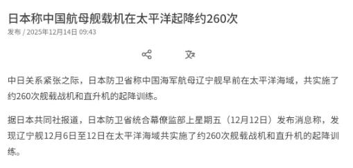 日本越看越紧张,日本方面公布了一个数据,自己估计也捏一把冷汗!12月14日,根据外媒报道,日本防卫省统合幕僚监部发布消息称,中国辽宁舰12月6日至12日在太平洋海域共实施了约260次舰载战机和直升机的起降训练。很显然,日本公布这一数据,这说明什么呢?   这背后透露出的信息,远比数字本身更有分量,日本防卫省能如此精确地掌握起降架次,说明他们调动了大量海空监视力量,对辽宁舰进行了全天候、不间断的抵近侦察。这种紧绷神经的状态,恰恰暴露了他们面对中国航母活动时极深的战略焦虑。   而这个260次的数字,对于任何懂军事的人来说都意义非凡,它意味着辽宁舰的舰载机运作已经达到了极高的熟练度和实战化水平,航母的战斗力并非单纯看其吨位大小,而是取决于舰载机出动的频率和效率。   一周内完成如此高强度的起降,表明从飞行员的技术到甲板的调度,再到整个航母编队的指挥体系,都已经磨合得相当顺畅,形成了一套可靠的作战流程。   有趣的是,这恰好击碎了日本国内长期以来对辽宁舰的一种傲慢偏见。在辽宁舰服役初期,日本舆论普遍对其持轻视态度,认为这不过是一艘改装的“训练舰”,无法形成真正的战斗力。   然而,事实胜于雄辩,当辽宁舰在家门口用无可辩驳的数据展示其成熟的战力时,这种实实在在的压迫感,远比任何口头警告都来得直接。   更值得玩味的是,日本这次的精确通报,也让自己陷入了逻辑上的困境,过去,日本频繁在国际上炒作所谓的“雷达照射”事件,将自己塑造成被中国“危险行为”威胁的受害者。   但现在这份详细的监控报告表明,他们对中国海军的动态了如指掌。既然看得如此清楚,所谓的“意外”和“误判”就显得站不住脚,这反而让人怀疑其之前是不是在蓄意制造摩擦,借机渲染地区紧张局势。   说到底,辽宁舰在西太平洋的这次常规训练,其本身就是一种战略沟通,它清晰地表明,中国海军的实力增长是不可逆转的趋势,这支力量的存在,不是为了挑衅谁,而是为了捍卫自身的正当权益。   面对这样一个已经崛起的邻居,是选择适应现实、和平共处,还是继续沉浸在过去的幻想中进行徒劳的对抗,这个选择题,现在正摆在日本自己的面前。