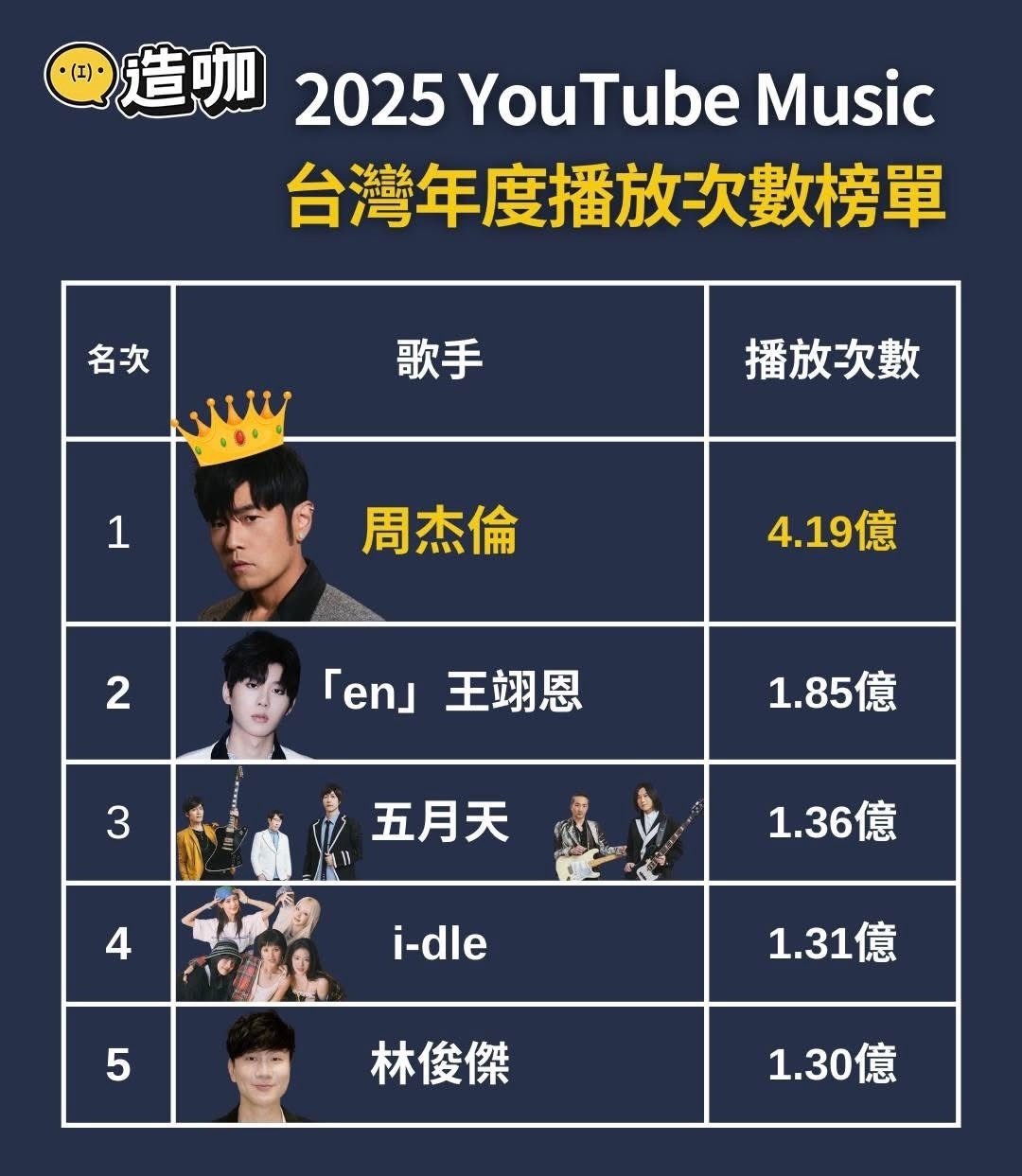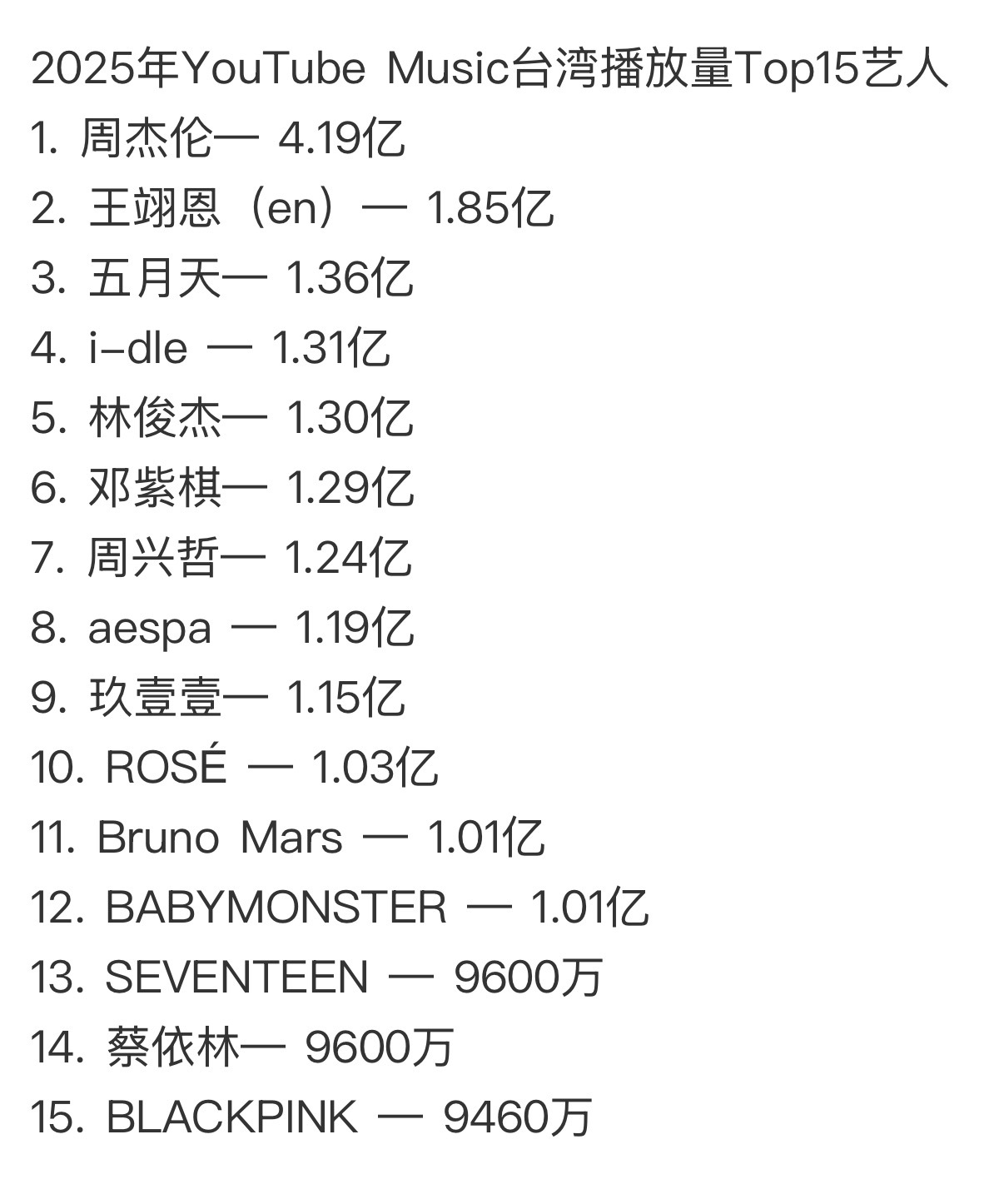 2025 YouTube Music台湾年度播放次数榜单YouTube Music日前公布了2025年度台湾地区播放次数最高前15名的歌手名单,华语天王周杰伦以4.19亿次播放量遥遥领先,稳坐年度冠军。网友对此排行展开热烈讨论,有网友表示:「杰伦的地位真的没人能撼动!」,「周董真的是传奇!」。