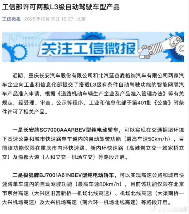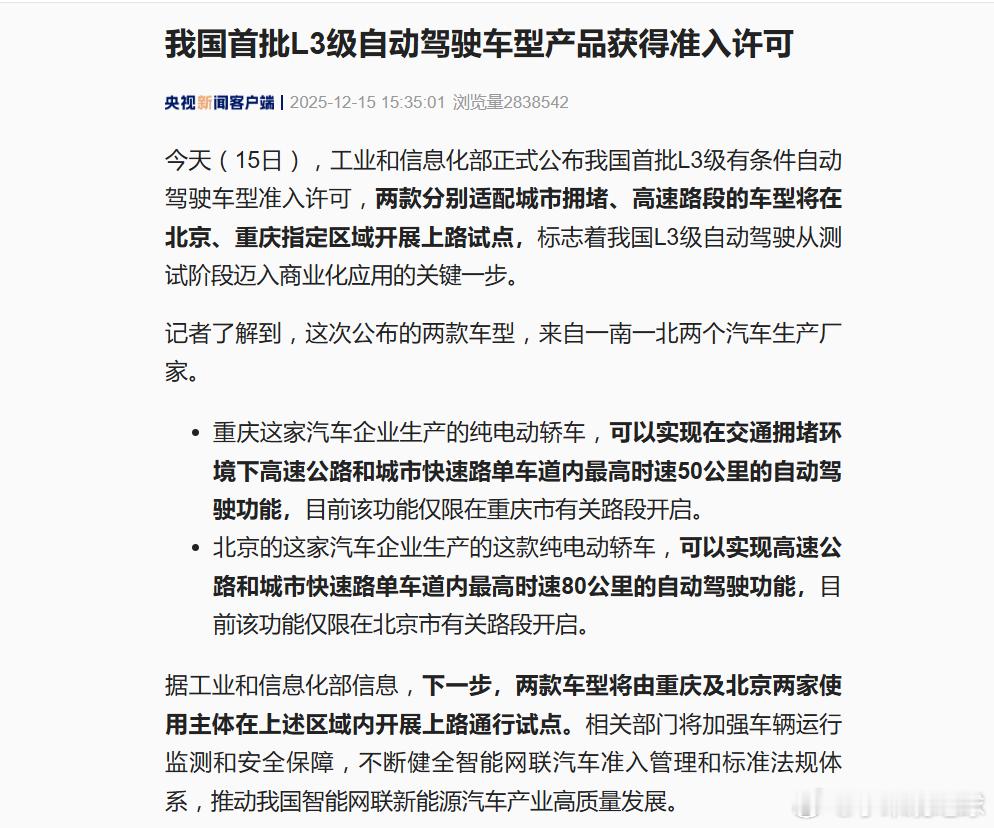 【我国首批L3自动驾驶车型获准入许可】L3自动驾驶将在京渝上路试点 12月15日,工业和信息化部正式公布我国首批L3级有条件自动驾驶车型准入许可,两款分别适配城市拥堵、高速路段的车型将在北京、重庆指定区域开展上路试点,标志着我国L3级自动驾驶从测试阶段迈入商业化应用的关键一步。