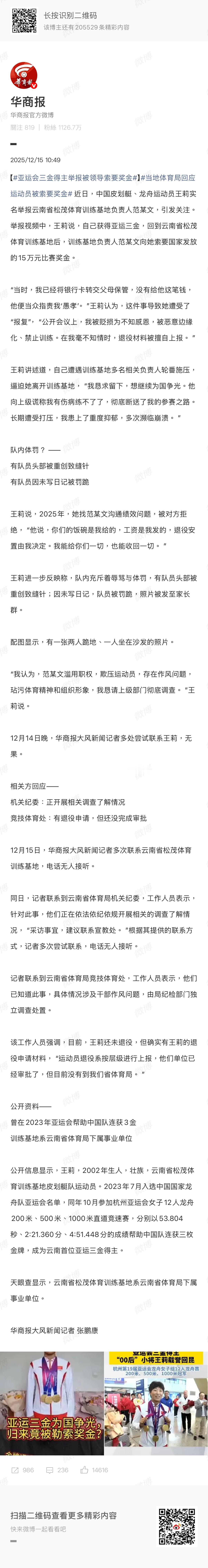 国家发给运动员的奖励领导凭什么伸手 很多人不理解为什么体育训练基地的教练员敢直言不讳、不带任何掩饰地找运动员要奖金。体圈是个很封闭的圈子。运动员的生涯本身就很短暂。从选拔到训练再到比赛,整个过程需要资源、背书,而这些东西的掌握权都在训练基地的教练上手。这也就是为什么大家能看到,运动员在没上交奖金之后,教练直接伪造退役申请、禁止其训练等一系列操作。并且这些操作压根不需要经过运动员本人知晓——这就是封闭圈子里一言堂的危害。这种事在体育圈里并不少见。去年的时候,黑龙江体育局重竞技运动员(一个拳击冠军)就实名举报教练员多年向运动员索要比赛奖金。6年间索要金额高达20万元。在这片被圈起来的地方里,权力压根就关不进笼子,反而很容易把人给圈进去。运动员十五六岁进队,正是三观塑成的时候,在这个封闭环境里泡上十年,外面的世界是啥样都快忘了。教练说东,那就是东。教练说「我培养你这么多年,拿点奖金不过分」,运动员听着好像也很合理。他们从进队第一天开始就被灌输「恩情教育」的,一年365天,天天给你念,念到你骨头里,到最后运动员自己都信了:我这命是教练给的,奖金本该就是他的。所以为啥不敢反驳?反驳的成本要么是整个前半生被全盘否定,要么是彻底推翻运动员一直以来的认知(这是最难的)。一个二十岁出头的运动员,小学毕业就进队,除了专项技能啥也不会,社会经验为零,法律知识全靠道听途说。他找谁替他撑腰?父母多半也是老实巴交的普通人,只想着孩子能拿成绩光宗耀祖。找体育局?很多训练基地的教练不是头一天在圈子里混的,他们在圈子里多少有些资源。而且,运动员一旦举报,几乎是「同归于尽」的存在。你举报了,队友的比赛名额会不会受影响?整个队的训练经费会不会被削减?这种集体压力比教练的拳头还重,压得你喘不过气。所以这也就是为什么圈子里默许的原因。因为这就是一条完整的利益输送链。教练拿大头,偶尔漏点汤给后勤和队医,大家都闭着眼有钱赚,何乐而不为?也许你会说,有法律呀。可问题是,运动员的奖金界限得很模糊,奖金是劳动报酬还是国家奖励给个人?没定论。也就是因为这种界限模糊的原因才给了权力无限的灰色地带。所以这也是为什么说在这个圈子里,没把权力关起来,反倒把人给圈起来的原因。有很多运动员直到退役那天,还觉得自己没混出来是因为「对不起教练的栽培」,压根儿没意识到,自己本该就是那笔奖金的主人。