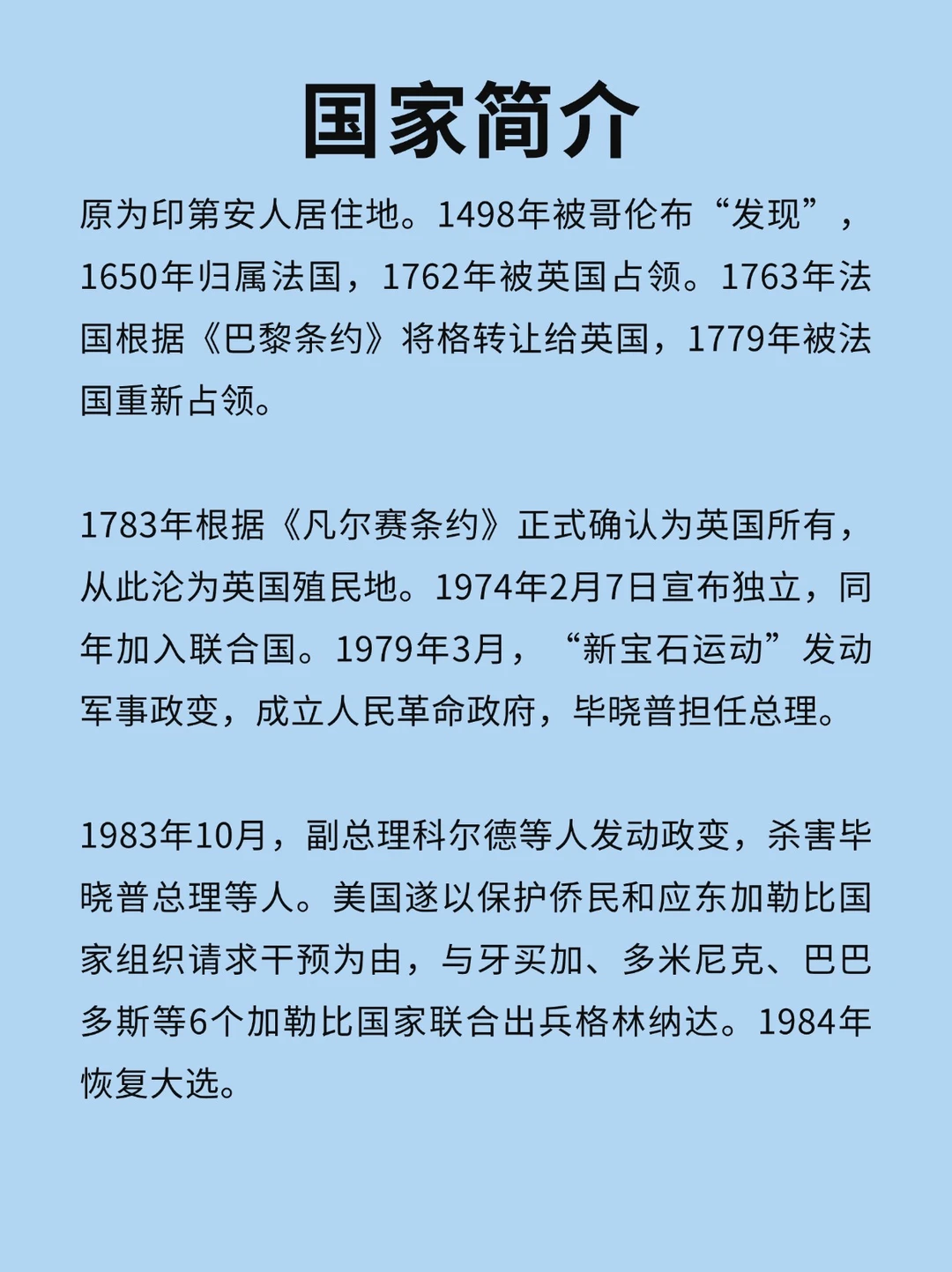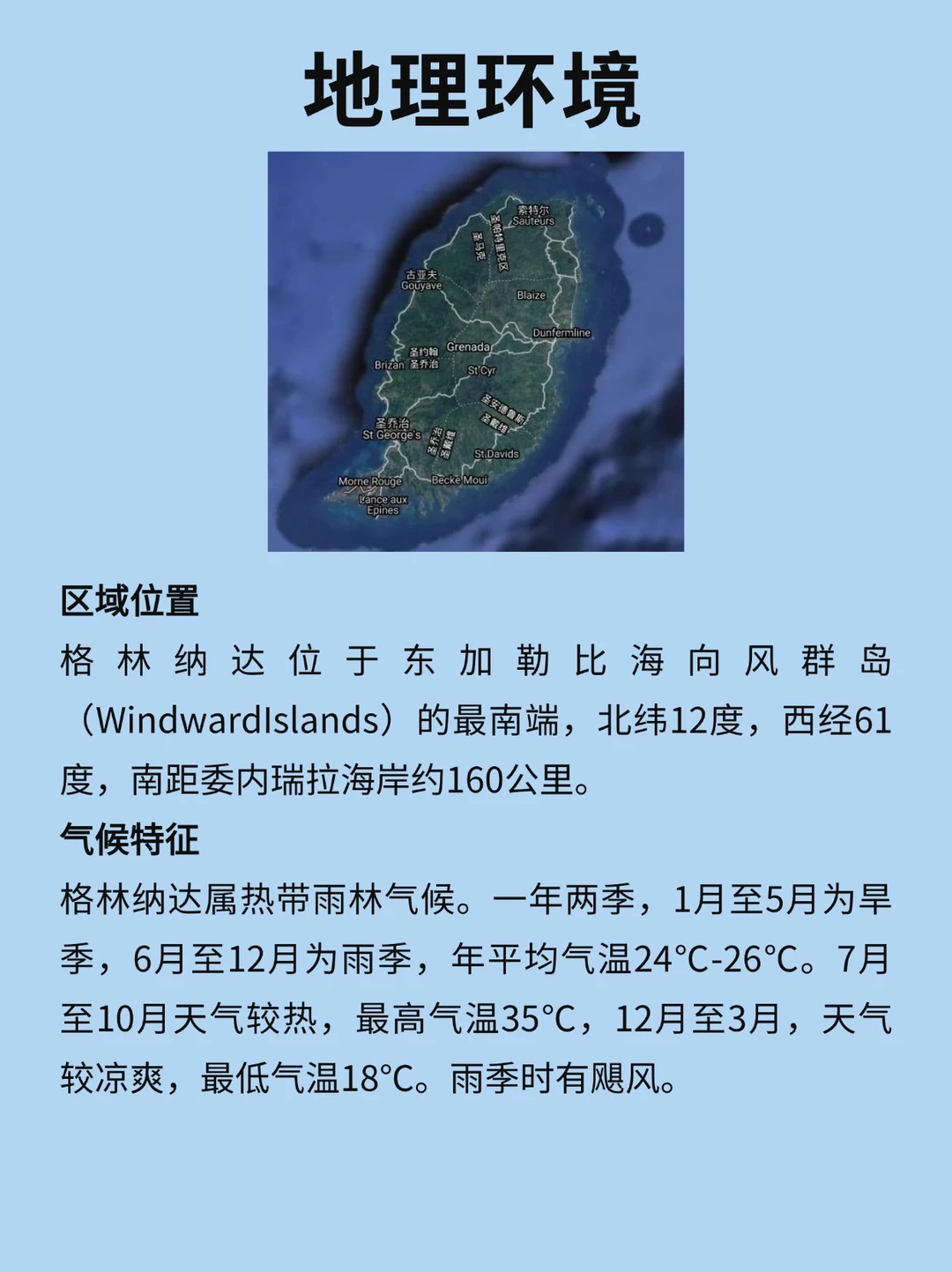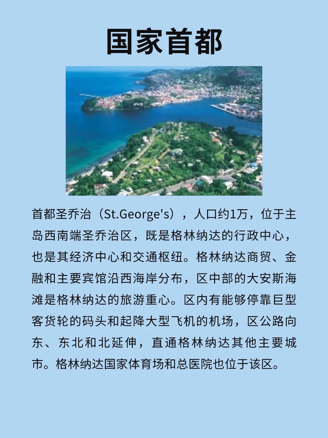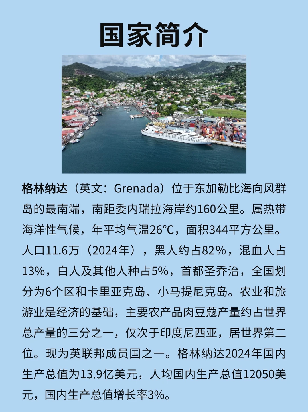 [打卡R]格林纳达(英文:Grenada)位于东加勒比海向风群岛的最南端,南距委内瑞拉海岸约160公里。属热带海洋性气候,年平均气温26℃,面积344平方公里。 [开箱R]人口11.6万(2024年),黑人约占82%,混血人占13%,白人及其他人种占5%,首都圣乔治,全国划分为6个区和卡里亚克岛、小马提尼克岛。 [飞盘R]农业和旅游业是经济的基础,主要农产品肉豆蔻产量约占世界总产量的三分之一,仅次于印度尼西亚,居世界第二位。现为英联邦成员国之一。 格林纳达2024年国内生产总值为13.9亿美元,人均国内生产总值12050美元,国内生产总值增长率3%。 -