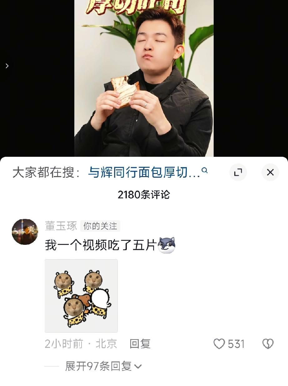 与辉同行连发三个定制吐司预告片。有网友急了艾特董宇辉,“一个视频10万单,三个视频30万单,你就发。”董宇辉回复:“啊这,那我撤回这几个视频。” 一听这话,得了,估计是没有30万单了。看来今天又要上演“抢吐司大战”了。 董董说:“拍一个视频吐司吃了5片。”估计是一个视频拍下来。就吃饱了,连中午饭也解决啦! 更有意思的是现在有的211同学学精了,她说提醒同学们不要抢黄油、红豆、巧克力味的,这三种口味一般,先拍其他口味的,把一般味道的留给她,她不介意的。 没想到董宇辉却关注到了这条信息并回复,“还是好人多呀。” 不得不说还是与辉同行的评论区热闹。同学之间的互动,同学与校长的互动,看着真是温馨又治愈。 不过今晚要想买吐司的同学们还是要打起精神来,一看这个节奏就是手慢无呀! 祝想买吐司的同学们都能如愿以偿! 董宇辉 与辉同行