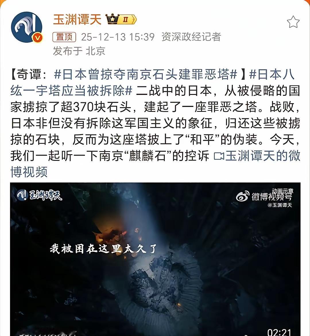 要持续不断的,向全世界揭露——日本军国主义的罪行,让世界各国,认清日本卑鄙和无耻的嘴脸。侵略时抢中国238块珍贵石材建塔,战败后改名“和平之塔”掩罪证,如今高市早苗还敢染指台海、拒不认错?中国不再隐忍,全球严正声明直击痛处!昔日软弱任人欺,今朝祖国够强大,犯我中华者必惩!欠我们的历史债,必须连本带利还!