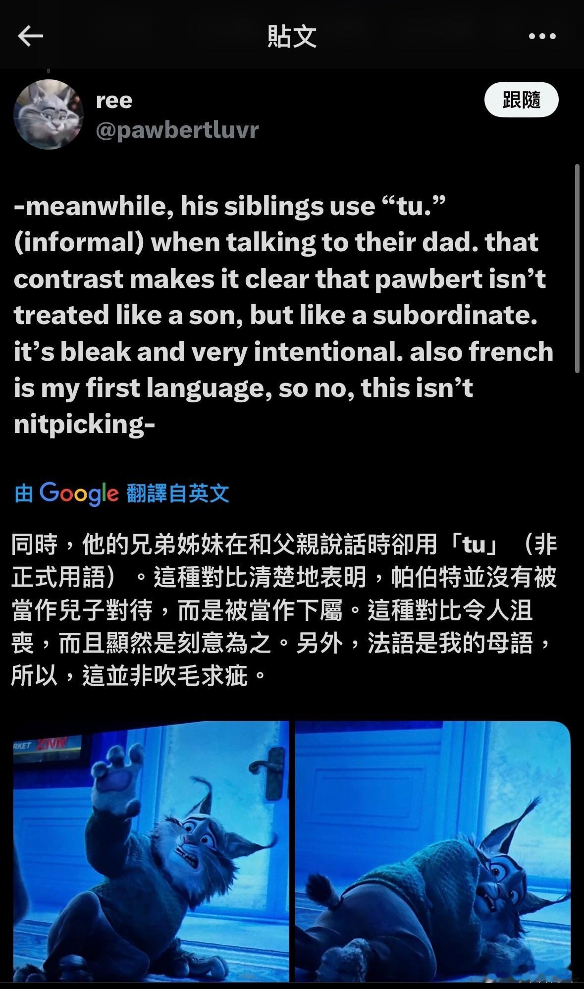 《疯狂动物城2》的一处细节。宝伯特没有被当作家人对待,而是被当作下属。
