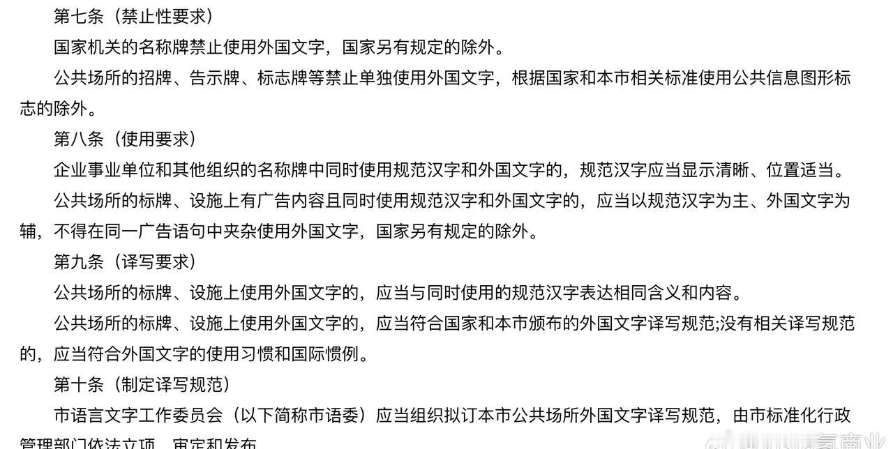 近日,有网友在上海街头发现,连锁烘焙品牌Drunk Baker门店在其英文招牌下方附有“装个贝壳”的中文名,引发热议。该网友发帖称:“你不知道自己叫醉师傅吗,啥时候改名装个贝壳了?”评论区还有网友分享了类似案例:连锁咖啡品牌Manner Coffee在上海的店面被标注了中文名“慢勒咖啡”,时尚品牌“niko and ...”则被称为“你可安”。有IP地址为上海的网友解释道:“上海因为英文招牌太多,要求必须有中文。” 对于这种现象的制度依据,可以追溯至《上海市公共场所外国文字使用规定》。该规定自2015年起施行,明确公共场所的招牌、告示牌、标志牌等禁止单独使用外国文字(根据国家和本市相关标准使用公共信息图形标志的除外)。 在使用要求上,公共场所的标牌、设施上有广告内容且同时使用规范汉字和外国文字的,应当以规范汉字为主、外国文字为辅,不得在同一广告语句中夹杂使用外国文字,国家另有规定的除外。在译写要求上,外国文字应当与同时使用的规范汉字表达相同含义和内容,且符合国家和本市颁布的外国文字译写规范;没有相关译写规范的,应当符合外国文字的使用习惯和国际惯例。@Vista氢商业
