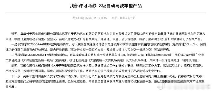 工信部许可两款L3级自动驾驶车型 看了一下,正好是一南一北1、长安牌SC7000AAARBEV型纯电动轿车,可在重庆指定高速 / 快速路的拥堵场景单车道自动驾驶(最高 50km/h)2、极狐牌BJ7001A61NBEV型纯电动轿车,能在北京指定路段实现高速 / 快速路单车道自动驾驶(最高 80km/h)我国首批l3自动驾驶车型获准入许可智能驾驶