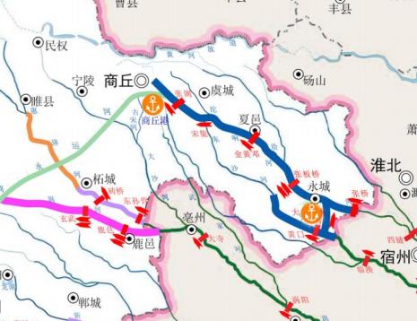 《商丘市内河航道与港口布局规划(2022-2035年)》(征求意见稿)中规划商丘港共8个港区,构筑“一主一副八区”港口布局。打造商丘中心港区、永城副中心港区,实现中心、虞城、夏邑、永城、睢县、宁陵、柘城、民权八个港区错位协同发展。 中心港区选址位于商丘市示范区境内与虞城县交界处,距离陇海铁路和京九铁路交汇处约15公里,距离京九铁路约6公里,铁水联运优势显著;济广高速、国道343、省道324等干线公路在此处形成多个十字交叉,县乡道交织成网,港区建设将形成“公铁水”多式联运新格局。 虞城港区位于虞城县南大候乡汤楼邵庄、沦河上,距虞城城区约5.5公里。虞城港区建设10个1000吨级泊位,港区总建筑面积4000平方米,新建2.5公里进港道路连接至国道343。