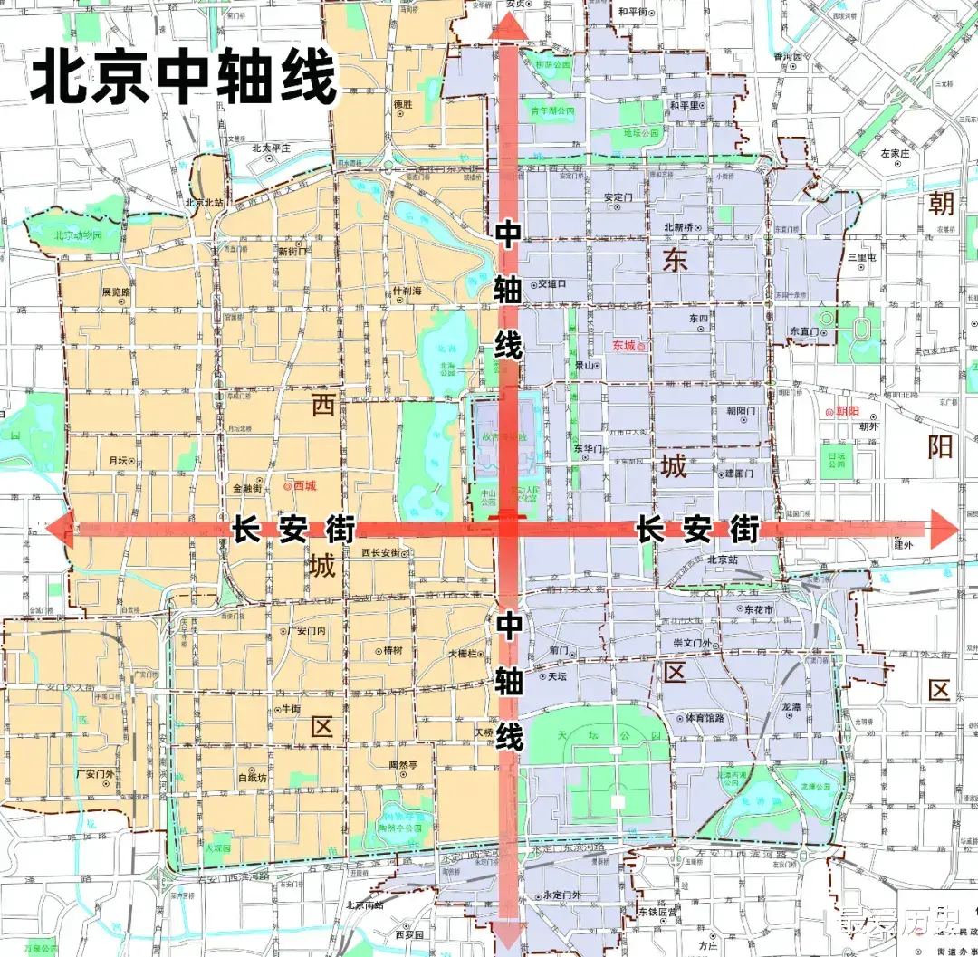 这条城市中轴线,恰好与北京的环形结构组成一个巨大的“中”字。