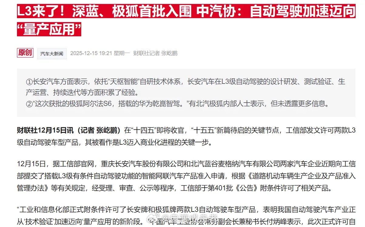 盘后,A股市场迎来四大重磅消息,其中寒王一则公告引发高度热议,该如何解读?明天A股又该重点关注什么?一文梳理清楚:1、寒王公告用资本公积补亏,该怎么看?很多股民看到消息后第一反应偏负面,有人质疑合法性,有人联想“拿募集资金补亏”,也有人认为是经营不善的体现。其实需冷静看待:根据2024年7月新修订的公司法,上市公司可用资本公积金弥补累计亏损,且需经股东大会决议,合法合规。寒王今年前三季度已盈利,此次用27.78亿元资本公积弥补2024年亏损,本质是优化财务报表——未分配利润转正后,可扫清后续分红、送股等回报投资者的障碍,严格来说是偏积极的信号,并非利空。建议大家理性看待财务操作,避免被情绪带节奏。2、沐曦股份12月17日科创板上市,会重演摩尔奇迹吗?参考此前摩尔上市后市值从200多亿飙升至翻20多倍,中签资金或能享受估值溢价,但重演大涨的可能性较低:公司已提示新股上市初期需审慎“炒新”,且市场对摩尔近期闲置资金理财消息仍有负面情绪余波,跟风炒作或较理性。对于未中签者,盲目跟风风险较高,需保持冷静。3、磷酸铁锂行业提价潮起,新能源产业链迎利好?头部企业提前锁单扩产,正极材料厂商集体提价,标志着新能源产业链“反内卷”初见成效。提价预期下,锂矿、光伏、风电、储能等上中下游或形成连锁反应,四季度及明年业绩改善预期增强。尽管前期板块已有一定涨幅,但回落中仍存机会,业绩驱动逻辑值得关注。4、工信部许可两款L3级自动驾驶车型,意义何在?这是L3级自动驾驶迈向商业化的关键一步:法规首次明确“系统和车企”承担主要责任,权责划分清晰,标志无人驾驶进入新纪元。利好方向明确:一是长安深蓝、北汽极狐等相关车企;二是激光雷达、智能底盘等零部件;三是高算力芯片、汽车芯片、高精度地图等产业链环节。预计明天无人驾驶及汽车核心零部件概念将成短线热点。5、明日指数及方向展望大盘大概率窄幅震荡,3850点是重要支撑位;创业板指数或承压,需关注CPO光模块能否止跌。板块方面,短期消费内需或强于科技(受美股AI科技泡沫担忧影响);无人驾驶概念受利好刺激,有望成为短线资金炒作焦点。今日市场缩量明显,跌破1.8万亿后,若继续缩量反倒不必过度恐慌。年底行情本就煎熬,建议把握节奏、控制仓位,避免追涨杀跌。