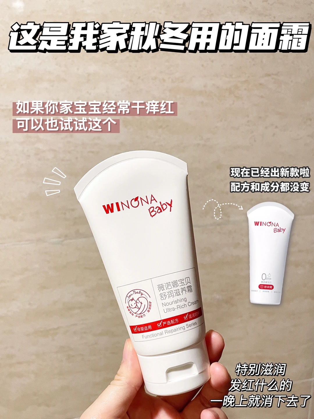 我家👶🏻皮肤一到秋冬就特别干燥且容易泛红,所以我很注重面霜的保湿性,用了3、4款下来,目前薇诺娜宝贝的舒润霜成了家中常备。舒润霜虽然是霜体,但一点都不粘腻,很好推开,我家宝宝连续使用了28天,每天早晚坚持涂抹,皮肤能保持一天滋润状态,不会像之前那样干燥起皮容易泛红了(效果因人而异)。如果你家宝宝一到秋冬皮肤就干燥粗糙,可以试试涂抹这个舒润霜。