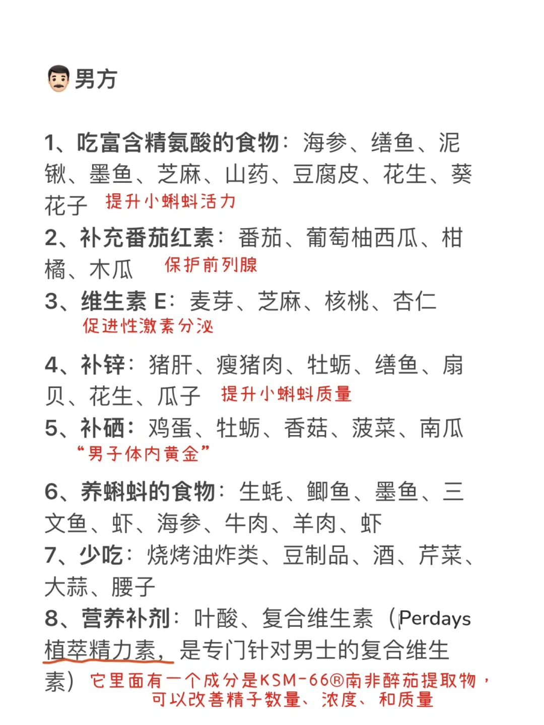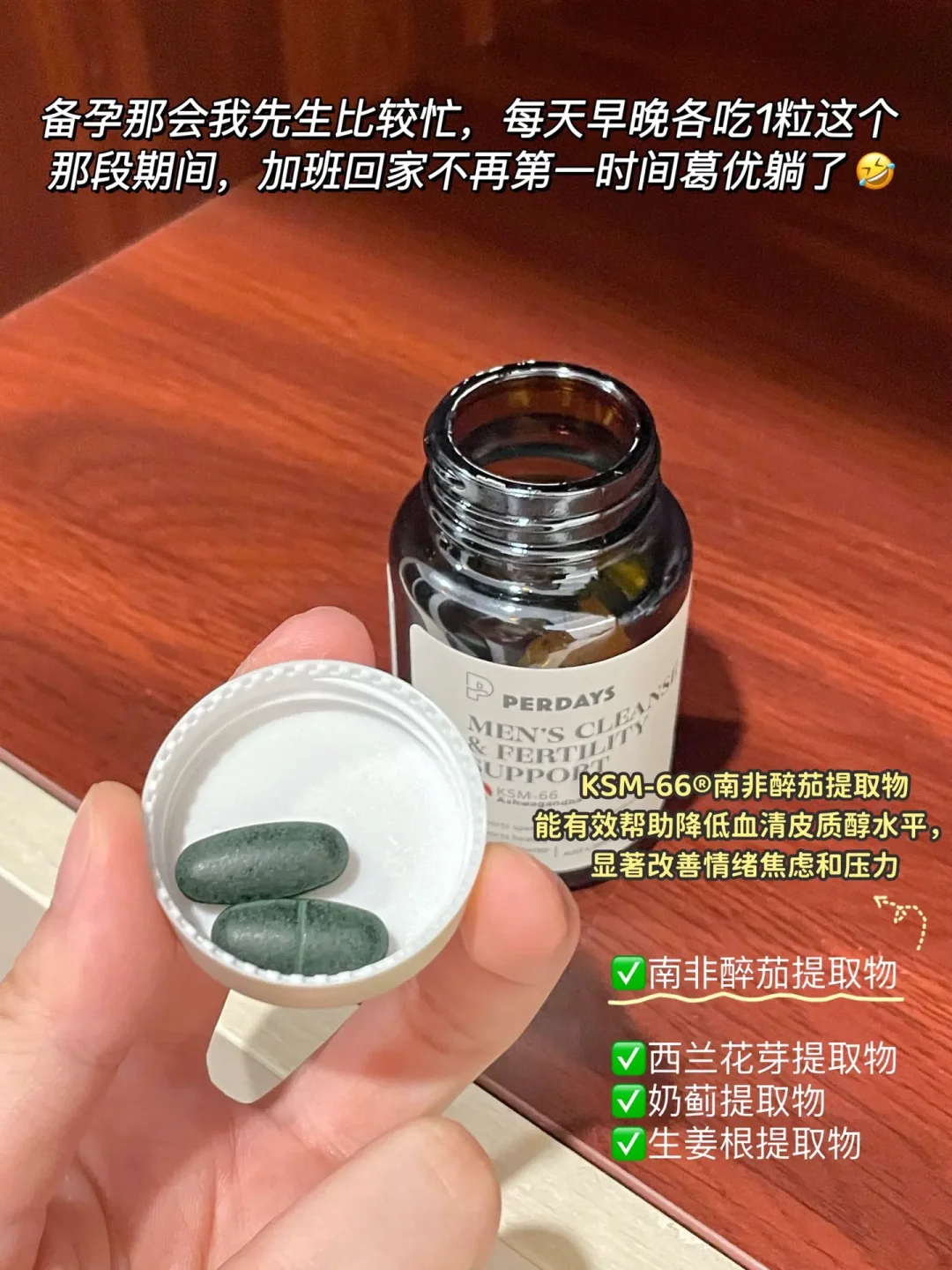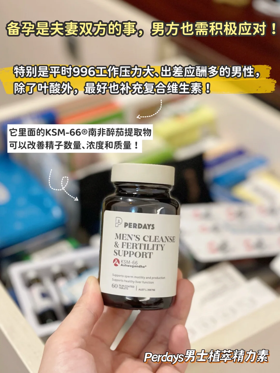 6、精子:多吃含锌高的食物,如牡蛎、海参、动物肝、坚果、瘦肉等,另外,如果男方平时工作压力大、熬夜多应酬,可以早晚各吃1粒Perdays备孕男士植萃精力素,其中的KSM-66®南非醉茄提取物可以改善精子数量、浓度和质量,帮助舒缓压力和情绪焦虑。
