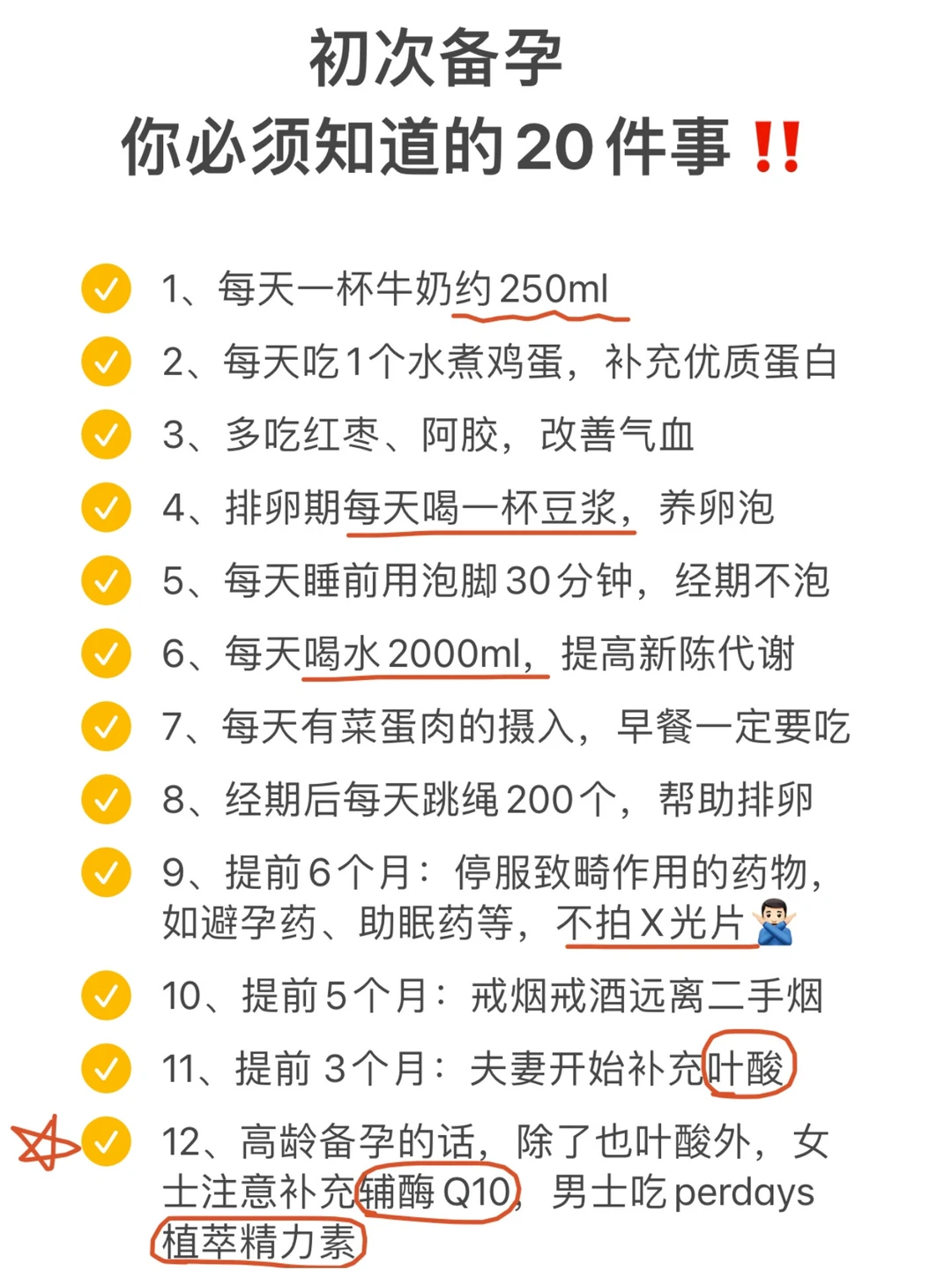 1、叶酸:夫妻双方提前3个月服用,防止胎儿畸形,每天0.4mg