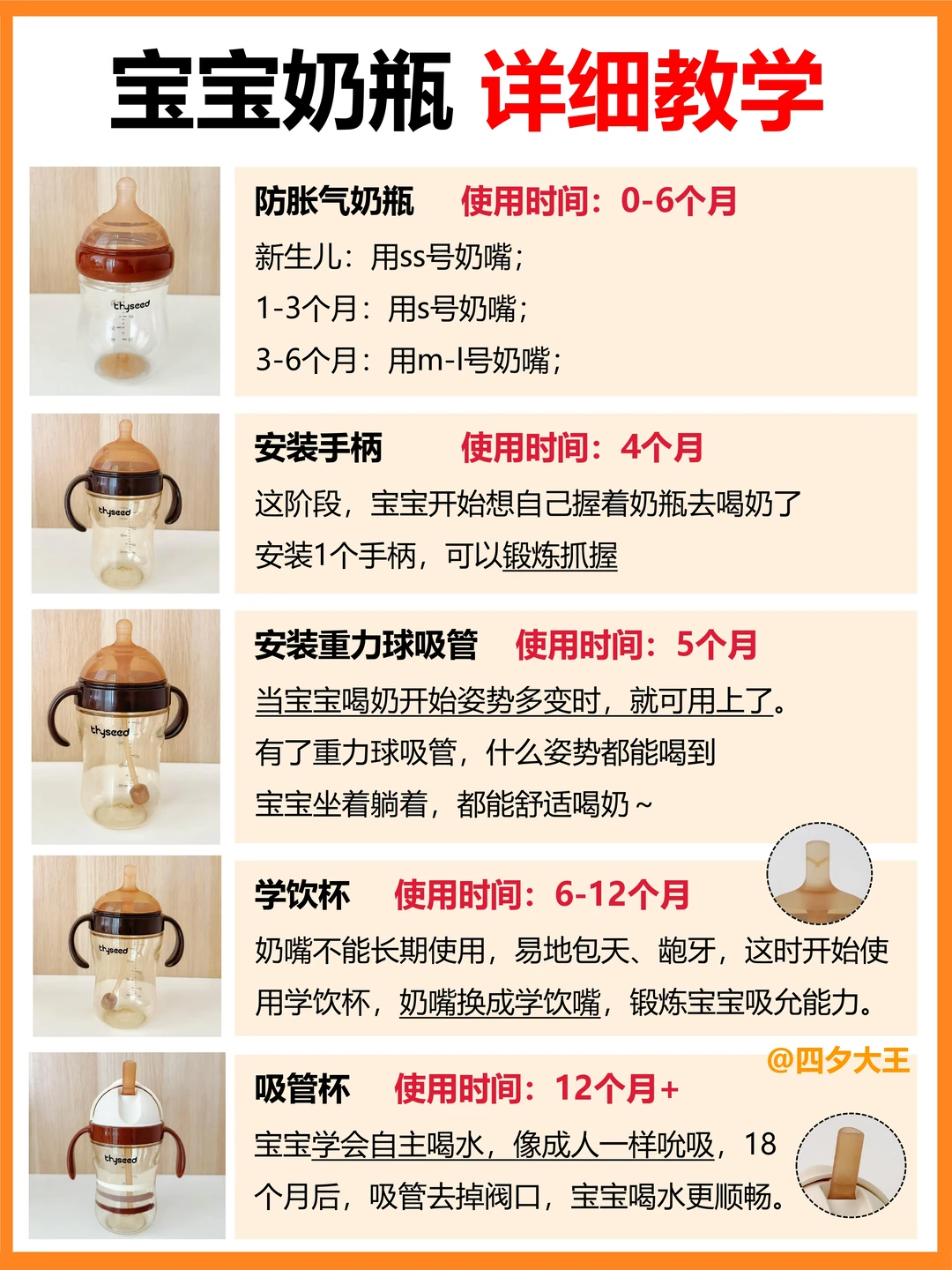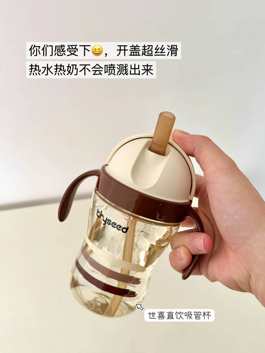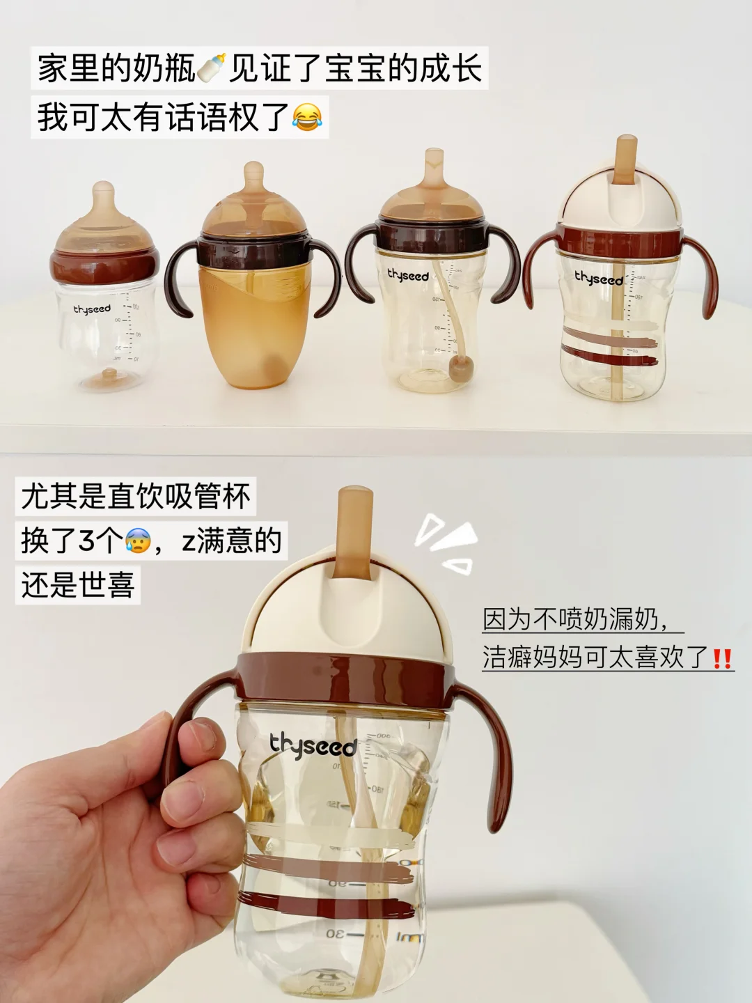 . 👉宝宝喝奶,各阶段用什么奶瓶⁉️ 👉几个月开始过渡?什么时候用吸管杯? 👉作为新手妈妈,你是不是也一样疑惑? 👉今天我决定梳理出来! . ⭕️本文重点: 1、顺序 2、教学 3、常见问题 4、喝奶量 5、喝水量 6、直饮吸管杯注意事项⚠️ . ⭕️补充: ✅超龄用奶嘴的4大危害 ▪️形成龋齿 ▪️面部变形 ▪️心里依赖 ▪️吐字不清 注:停止使用奶瓶最晚不应超过18个月 . ✅宝宝4种主要的杯子类型 奶瓶(0-6个月) 学饮杯(6-12个月) 吸管杯(12个月+) 敞口杯(18个月+) . ⭕️再说说宝宝杯子的一些想法 1️⃣头3个月容易肠胀气,新生儿奶瓶要重点👉看防胀气功能,最好是用玻璃瓶材质,导热快 2️⃣当宝宝有自主抓握意识、奶量大增的时候,建议换成ppsu材质的奶瓶 3️⃣鸭嘴杯也是属于学饮杯的一种,一般是从鸭嘴杯过渡到学饮杯的,但其实也可以直接跳过,具体看宝宝的适应能力 4️⃣吸管杯和学饮杯最大的区别👉就是去掉了重力球,因为没有了重力球,所以宝宝喝水时就要坐直才能喝到,可以锻炼到好的喝水习惯 5️⃣吸管杯有2种,一种是有阀口的,一种是无阀口的,妈妈要时刻关注宝宝的喝水情况,如果开始觉得喝水费劲了,就立马更换成无阀口的直饮吸管杯,这样宝宝才能大口大口的喝水! . ✅直饮吸管杯,建议买这种的: 1、翻盖设计,不用担心宝宝丢掉而找不到 2、开盖不喷奶、合盖不漏奶! 3、ppsu材质,碰摔不会坏 🔹个人觉得世喜直饮吸管杯超好用,奶瓶级ppsu材质的,耐摔抗造,喝奶也很安全~✔️开盖丝滑不卡顿,喝水喝奶娃都可以自己打开,而且不喷不漏,不像别的水杯那样盖子打开喷一脸水😰! 🔹专为1岁半以上儿童👶🏻定制直饮吸嘴,没有阀口,喝水很轻松,自从换了世喜的后,我孩子吨吨吨的每天喝很多水‼️所以,如果你孩子不怎么爱喝水,考虑一下是不是水杯喝水费劲了,那么可以换成世喜儿童吸管杯试试[拔草R] . 以上! 宝宝的奶瓶、水杯真的不复杂 如果你孕晚期待产中,或者是新手妈妈 看完这篇笔记,就一定知道怎么买啦~