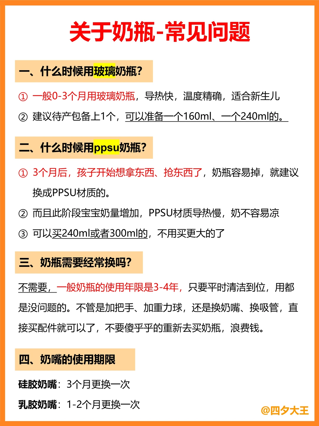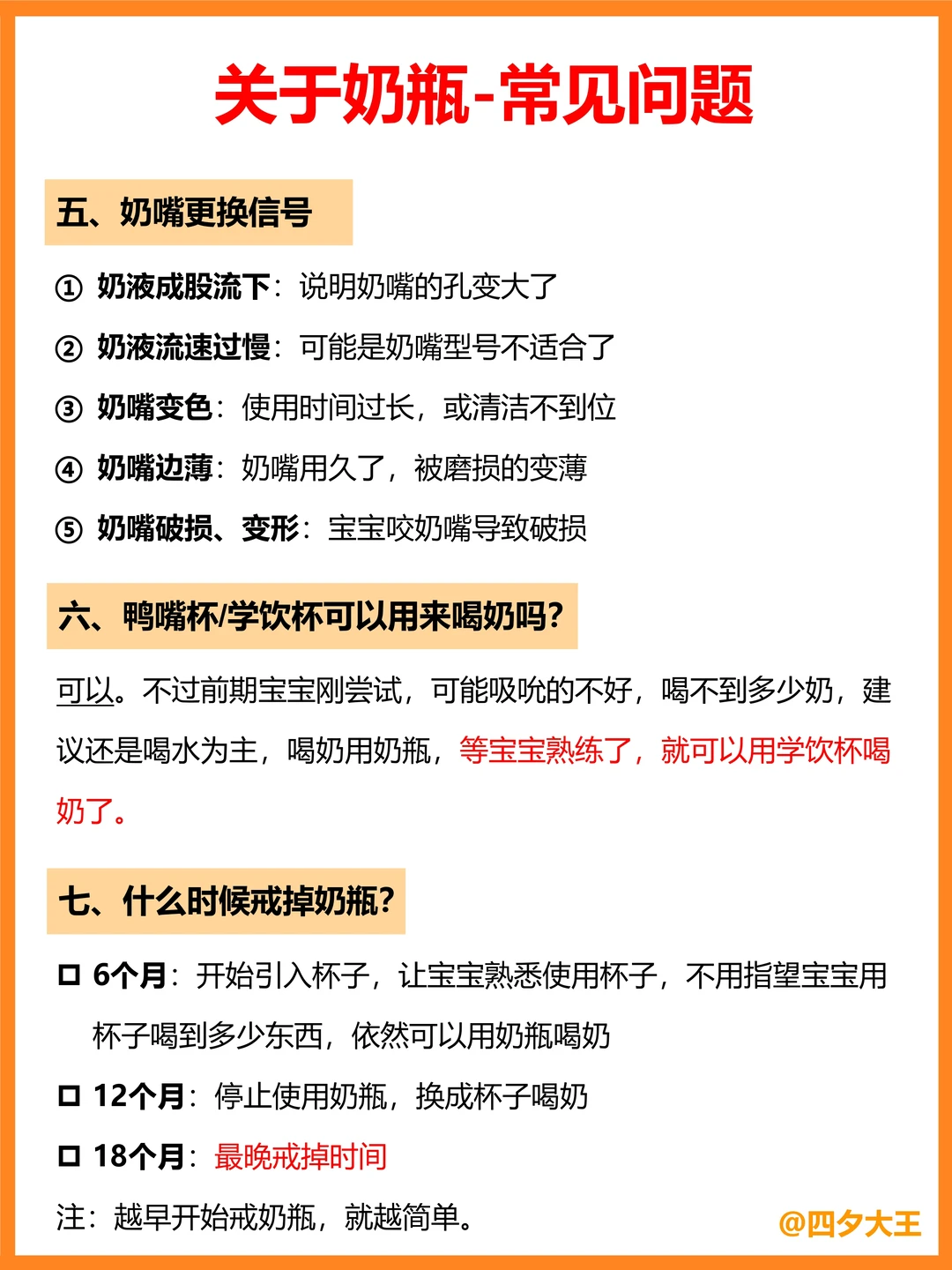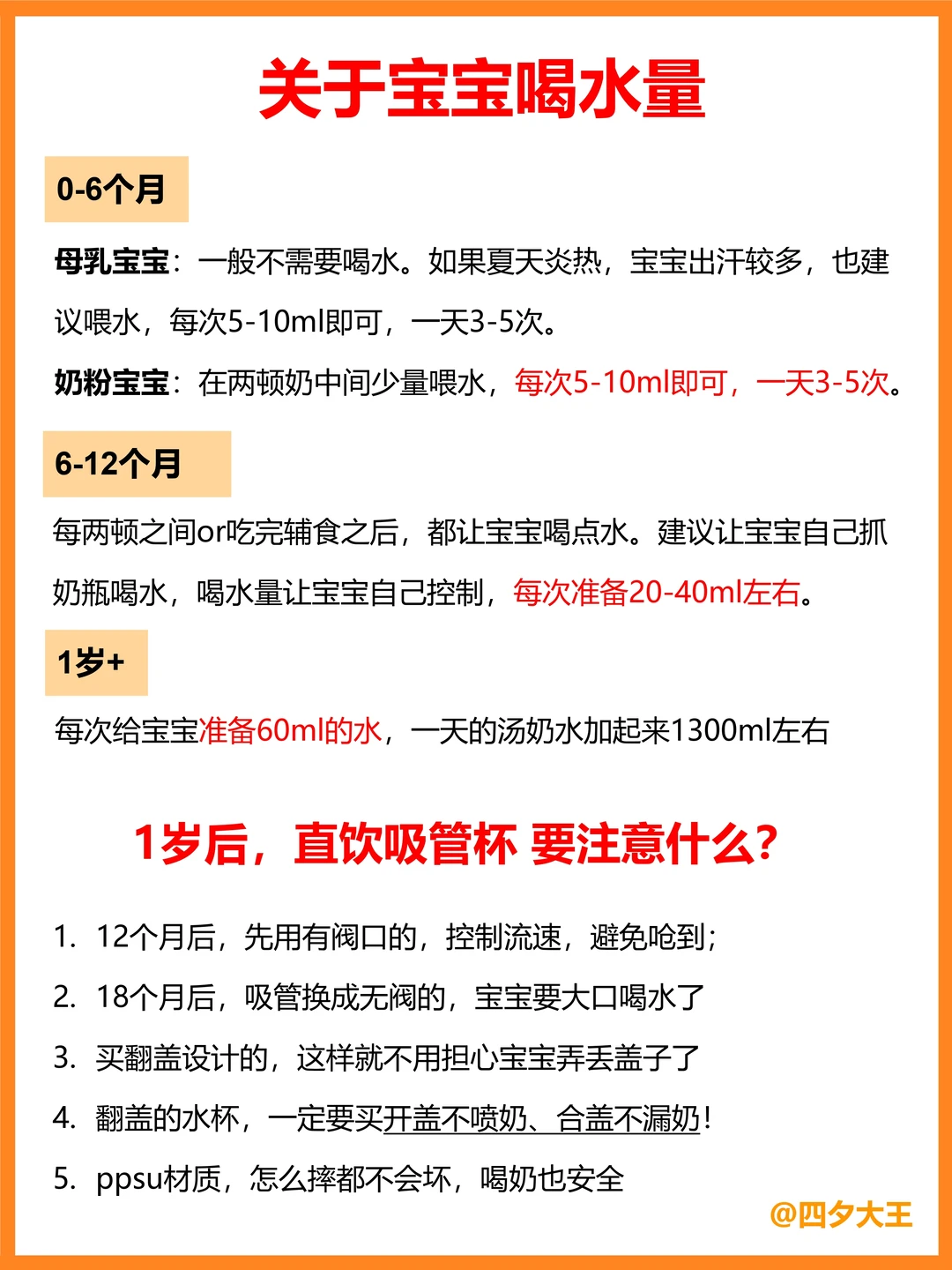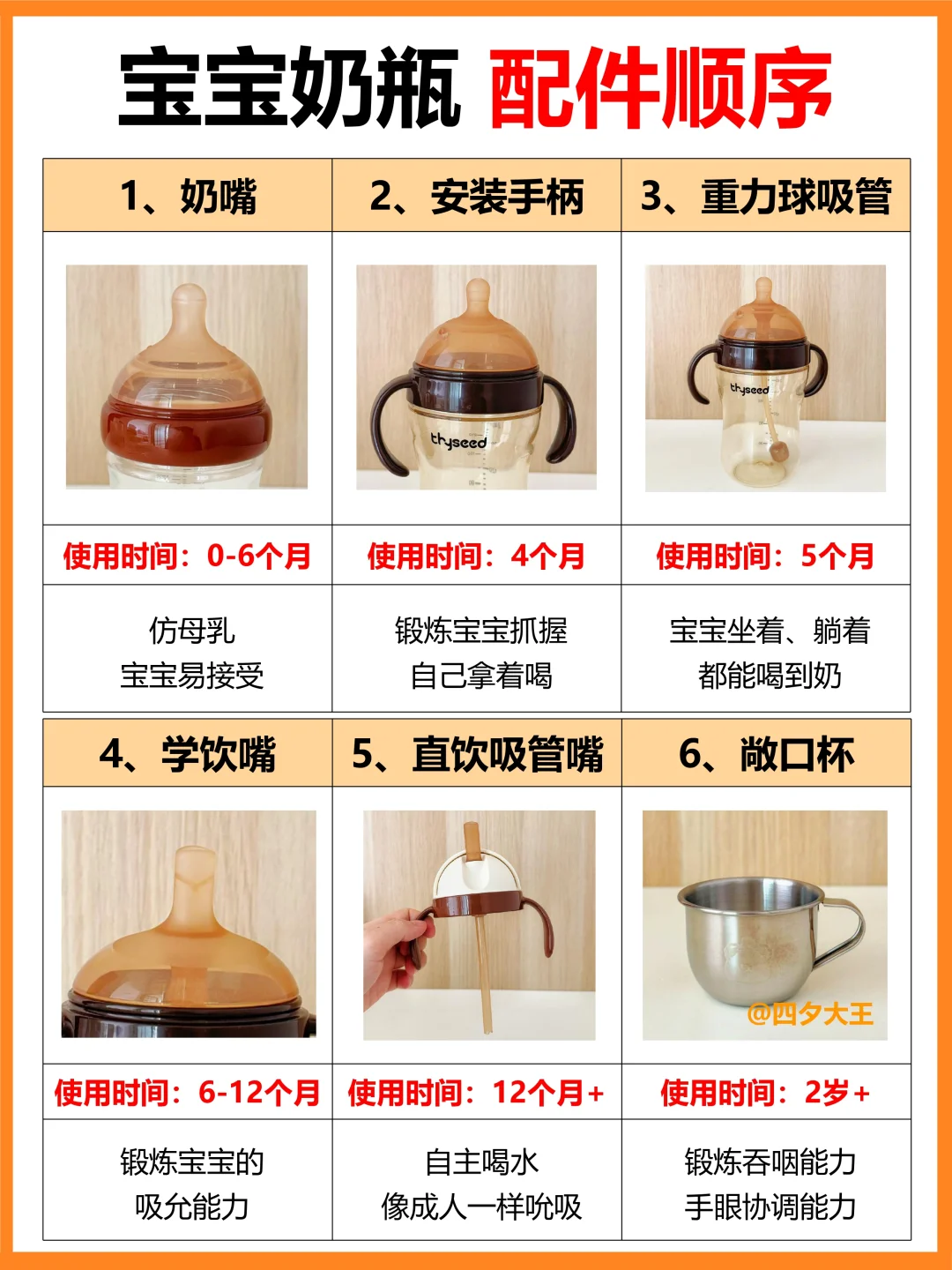 . 👉宝宝喝奶,各阶段用什么奶瓶⁉️ 👉几个月开始过渡?什么时候用吸管杯? 👉作为新手妈妈,你是不是也一样疑惑? 👉今天我决定梳理出来! . ⭕️本文重点: 1、顺序 2、教学 3、常见问题 4、喝奶量 5、喝水量 6、直饮吸管杯注意事项⚠️ . ⭕️补充: ✅超龄用奶嘴的4大危害 ▪️形成龋齿 ▪️面部变形 ▪️心里依赖 ▪️吐字不清 注:停止使用奶瓶最晚不应超过18个月 . ✅宝宝4种主要的杯子类型 奶瓶(0-6个月) 学饮杯(6-12个月) 吸管杯(12个月+) 敞口杯(18个月+) . ⭕️再说说宝宝杯子的一些想法 1️⃣头3个月容易肠胀气,新生儿奶瓶要重点👉看防胀气功能,最好是用玻璃瓶材质,导热快 2️⃣当宝宝有自主抓握意识、奶量大增的时候,建议换成ppsu材质的奶瓶 3️⃣鸭嘴杯也是属于学饮杯的一种,一般是从鸭嘴杯过渡到学饮杯的,但其实也可以直接跳过,具体看宝宝的适应能力 4️⃣吸管杯和学饮杯最大的区别👉就是去掉了重力球,因为没有了重力球,所以宝宝喝水时就要坐直才能喝到,可以锻炼到好的喝水习惯 5️⃣吸管杯有2种,一种是有阀口的,一种是无阀口的,妈妈要时刻关注宝宝的喝水情况,如果开始觉得喝水费劲了,就立马更换成无阀口的直饮吸管杯,这样宝宝才能大口大口的喝水! . ✅直饮吸管杯,建议买这种的: 1、翻盖设计,不用担心宝宝丢掉而找不到 2、开盖不喷奶、合盖不漏奶! 3、ppsu材质,碰摔不会坏 🔹个人觉得世喜直饮吸管杯超好用,奶瓶级ppsu材质的,耐摔抗造,喝奶也很安全~✔️开盖丝滑不卡顿,喝水喝奶娃都可以自己打开,而且不喷不漏,不像别的水杯那样盖子打开喷一脸水😰! 🔹专为1岁半以上儿童👶🏻定制直饮吸嘴,没有阀口,喝水很轻松,自从换了世喜的后,我孩子吨吨吨的每天喝很多水‼️所以,如果你孩子不怎么爱喝水,考虑一下是不是水杯喝水费劲了,那么可以换成世喜儿童吸管杯试试[拔草R] . 以上! 宝宝的奶瓶、水杯真的不复杂 如果你孕晚期待产中,或者是新手妈妈 看完这篇笔记,就一定知道怎么买啦~