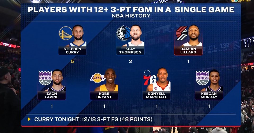 ▲单场命中12+记三分球的球员历史上有7个人▲库里一个人占了5次