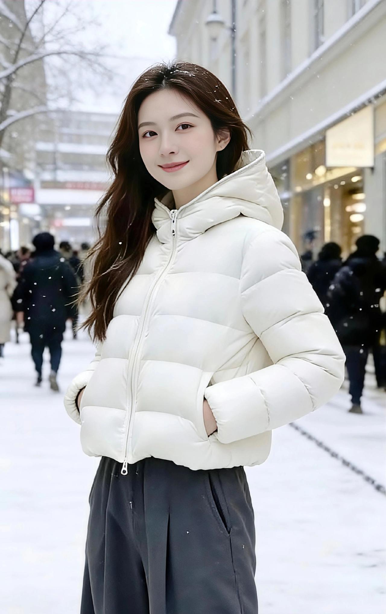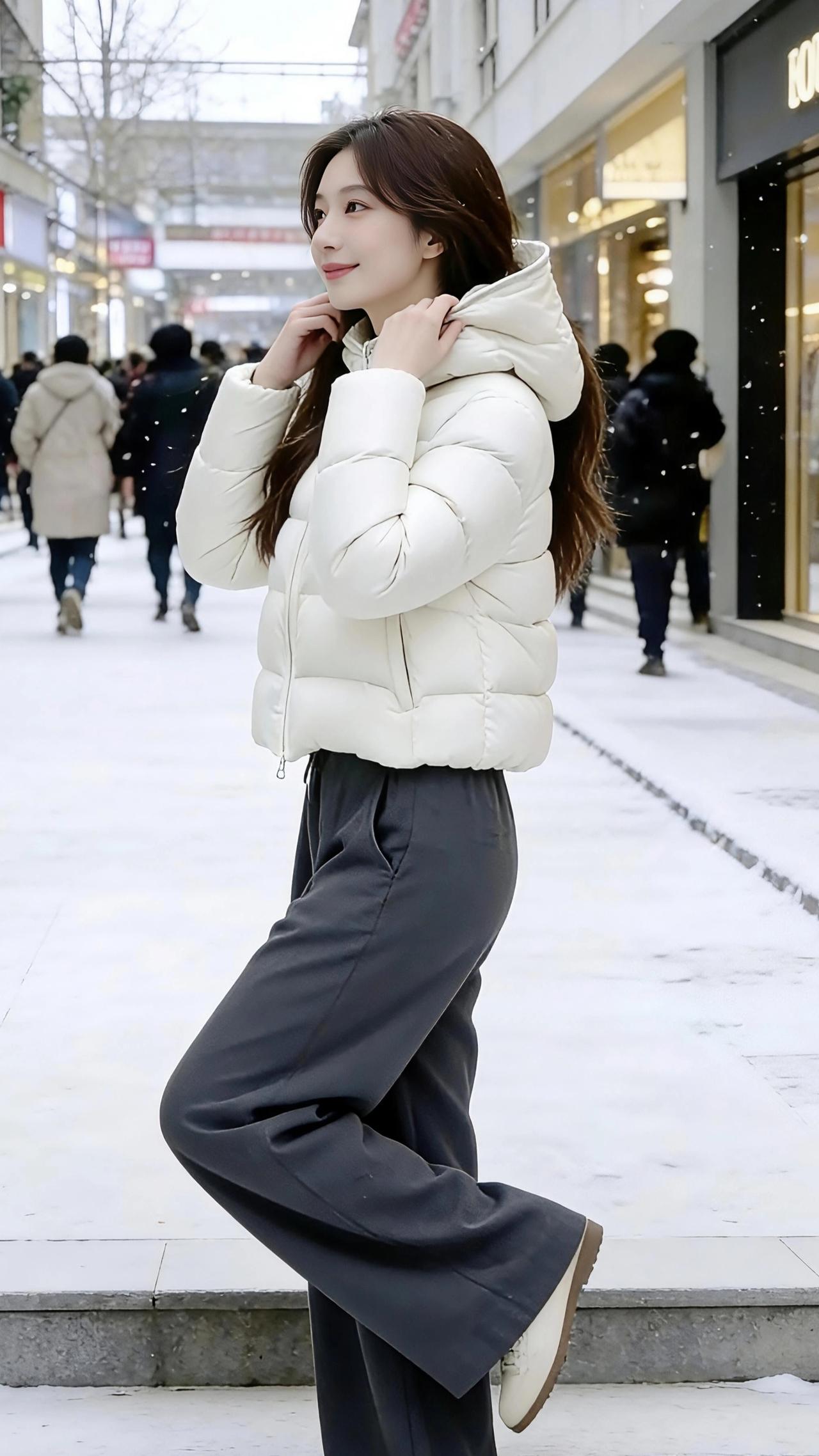 雪街暖袄 冬日的商业街被薄雪轻覆,像给繁华的街道披了层绵软的白纱,晴空万里下,阳光揉碎了洒在雪面上,折射出细碎的光,连街边的橱窗都仿佛裹了层温柔的光晕。 她立在雪色里,奶白色短款羽绒服蓬松得像云朵,拉链利落拉至领口,兜帽松松搭在肩头,袖口的弧度衬得手腕纤细。手揣进衣兜的瞬间,羽绒服的柔软轮廓更显俏皮,与脚下落着细雪的石板路相映,冷冽的冬风都似被这抹暖白温柔拦下。 双臂轻抱时,羽绒服的菱格纹路在阳光下舒展,利落的线条勾勒出少女高挑的身形,深灰阔腿裤垂坠着,与白袄撞出简约的层次感。她抬手轻拢兜帽,指尖触到面料的瞬间,身体微微侧转,一脚轻点台阶,长发随动作轻扬,发梢的雪粒簌簌落下,像揉碎的星光。 仰头望时,阳光吻上她含笑的眉眼,浅红的唇瓣弯着温柔的弧度,羽绒服的暖白衬得肌肤胜雪。这一方雪街的清冷,竟因这一件暖袄、一个笑靥,化作了冬日里最动人的风景,仿佛世间所有的温柔,都凝在了这雪晴时分的商业街,凝在她与暖袄相拥的模样高级感穿搭 小个子穿搭 冬季穿搭 棉衣棉服