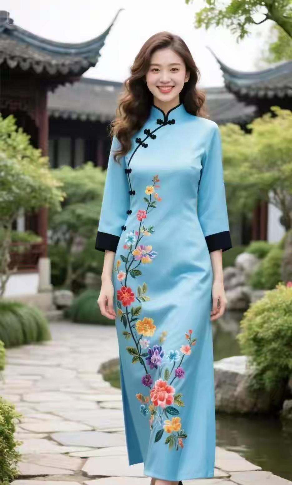 蓝袍佳人 蓝韵妖姬意韵长, 旗袍绣蕊映容光。 大方善解情丝绕, 惹动诗心梦也香。
