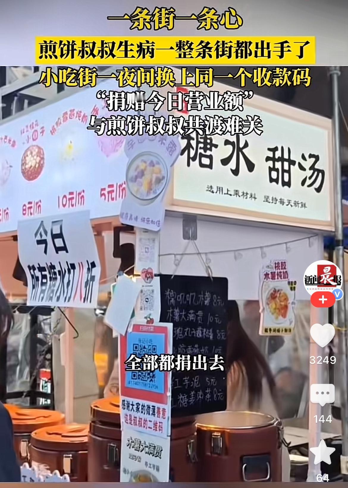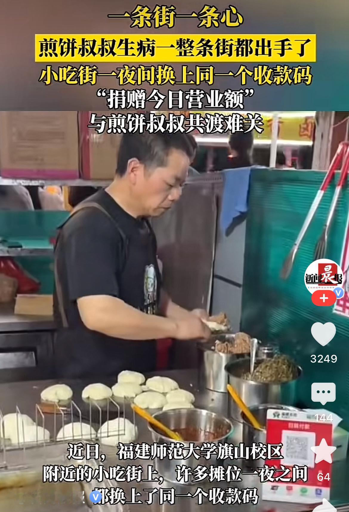 一大早, 给我真破防了, 这才是人间有爱具象化了,一群小吃街摊主为了帮助生病的煎饼叔叔,自愿捐出一天的所有收益! 原来和他们在一条小吃街摆摊的煎饼叔叔因为癌症住院了,需要花费不少钱。 此时小吃街的所有摊主主动把自己的收款码换成了煎饼叔叔的,把一天的销售额全部捐出去,帮助煎饼叔叔共渡难关。 真的太让人感动了,希望煎饼叔叔可以早点好起来,有那么多爱他的人。