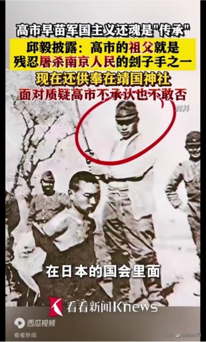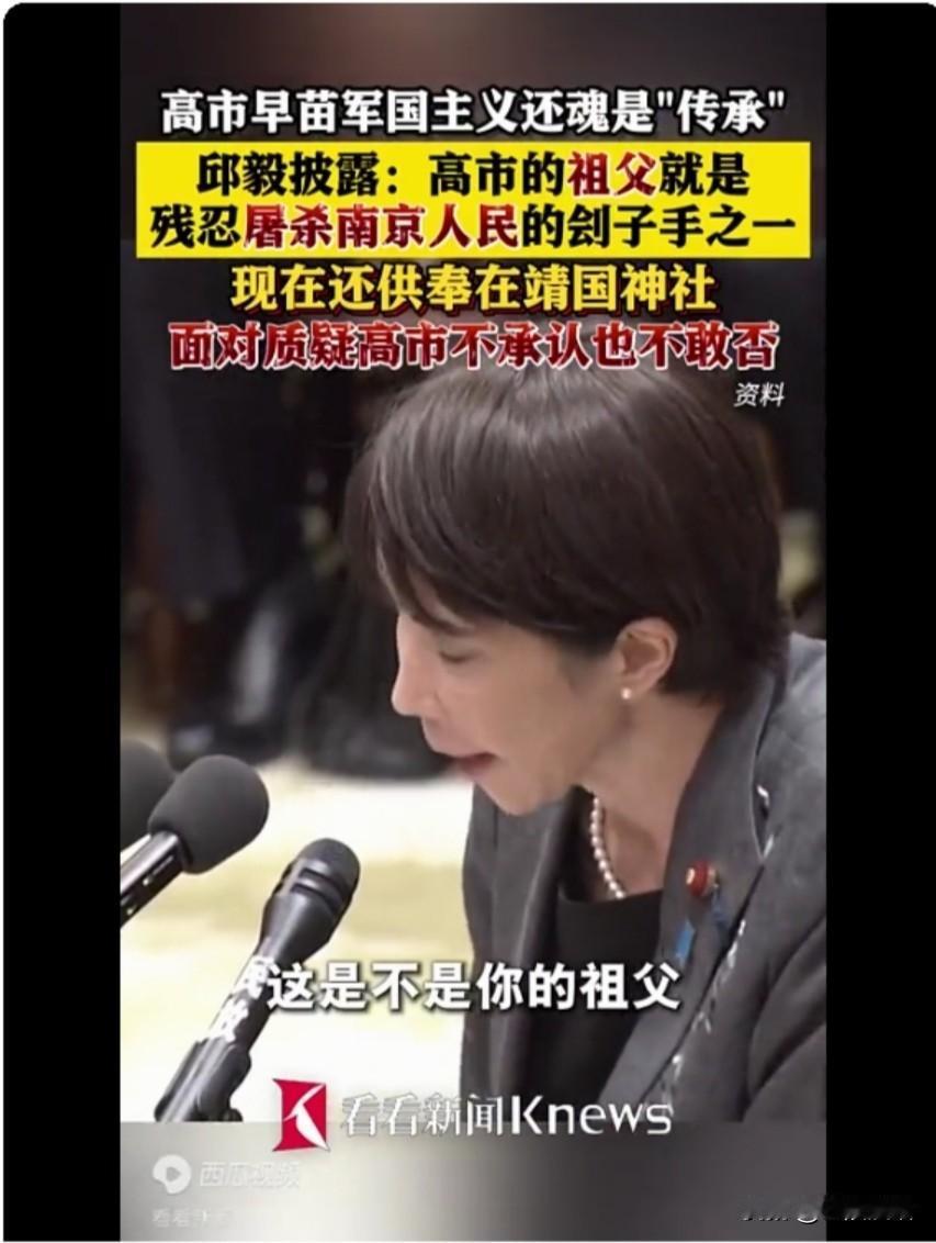 台湾名嘴邱毅前几天透露,日本首相高市早苗的祖父高市利彦(也有的说叫高市正雄)以侵华日军陆军少佐的身份参加过南京大屠杀(也有的说在一二八事变中还杀害过上海平民),死后还供奉在靖国神社。并且邱毅还强调说,面对他人“这是不是你祖父”的质问,高市早苗不承认也不否认。 如果这个消息属实,高市早苗有参拜靖国神社、否认南京大屠杀、质疑“慰安妇”、推动日本修宪并谋求军事扩张、宣称“台湾有事就是日本有事”等一系列极端右翼言行就迎刃而解啦! “播什么种结什么果”。想想:在这种家庭里出生,受这种家庭教育影响的孩子成为极端右翼分子有什么奇怪的呢? 由于清算不彻底,在如今的日本,像高市早苗这样的极端右翼分子不在少数,我们必须高度警惕。