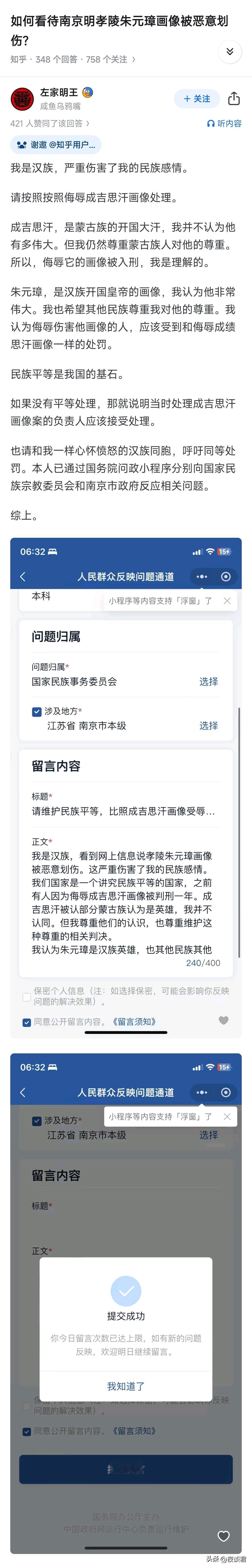 如何看待南京明孝陵朱元璋画像被恶意划伤? 鞋拔子芒果脸挂了几十年无人破坏,一换真容立马跑来破坏了。 所以大家猜猜当年众口铄金说鞋拔子脸是真的东西的人到底知不知道真相。 本质上爱与恨是同一种情绪体验。朱元璋逝世627年了,为什么还有人恨他,拿那么多经费去侮辱他? 划伤一个代表封建主义的剥削者,这没什么。 但你要按这套阶级史观来,有人对刘吉思汗和洪烨做同样的事情,也别有人哈气。 曾经有个哥们踩成吉思汗的画像以“伤害民族感情”被判了一年,怎么也得一视同仁吧。 问题就在这里,面对别人的祖宗和民族时用阶级史观要求别人,面对自己的祖宗和民族时就这些都是神圣不可侵犯,不许伤害我的感情。 这不纯双标吗?