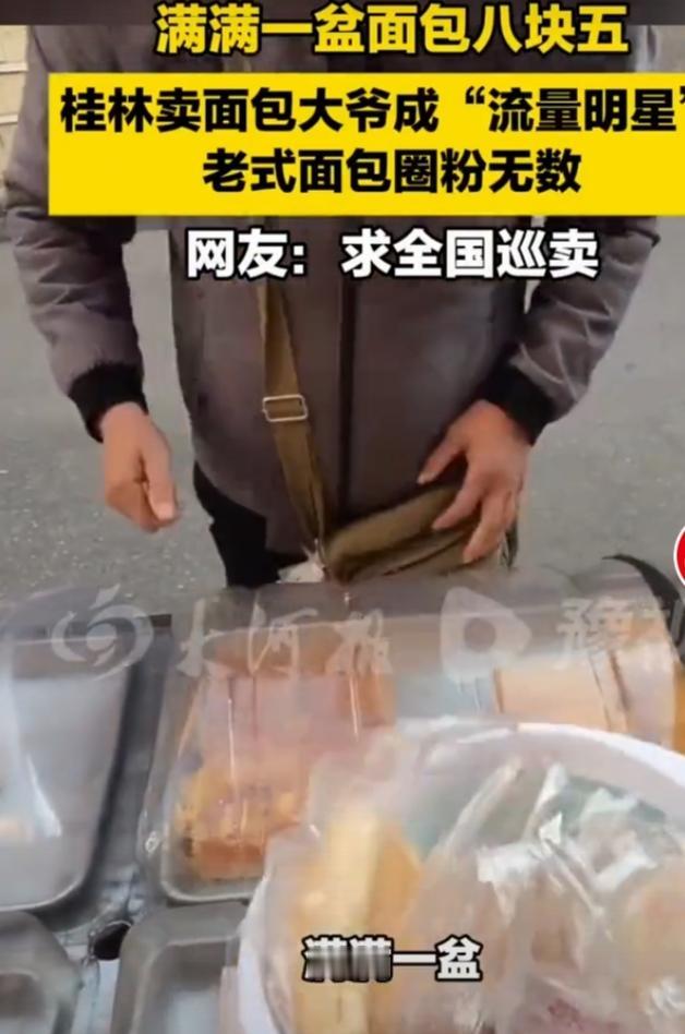 桂林卖面包大爷成了“流量明星”,真是太有意思了。5月20日有人碰到这位大爷,他的面包三轮车停在路边,车上满满当当全是老式面包,芋泥卷、油炸三明治面包等种类丰富。好多人在抖音刷到他,还加了微信专门来买。买面包时,顾客用卡通伸缩棒指指点点,大爷都乐呵呵地帮忙拿。满满一盆面包才8.5块,价格实惠。这面包没有花里胡哨包装,就是童年的味道。还有位在桂林做欧包25年的烘焙师梁勇,也是面包界的匠人。桂林这两位面包从业者,一个靠烟火气和童年味出圈,一个凭匠心坚守,都值得点赞!