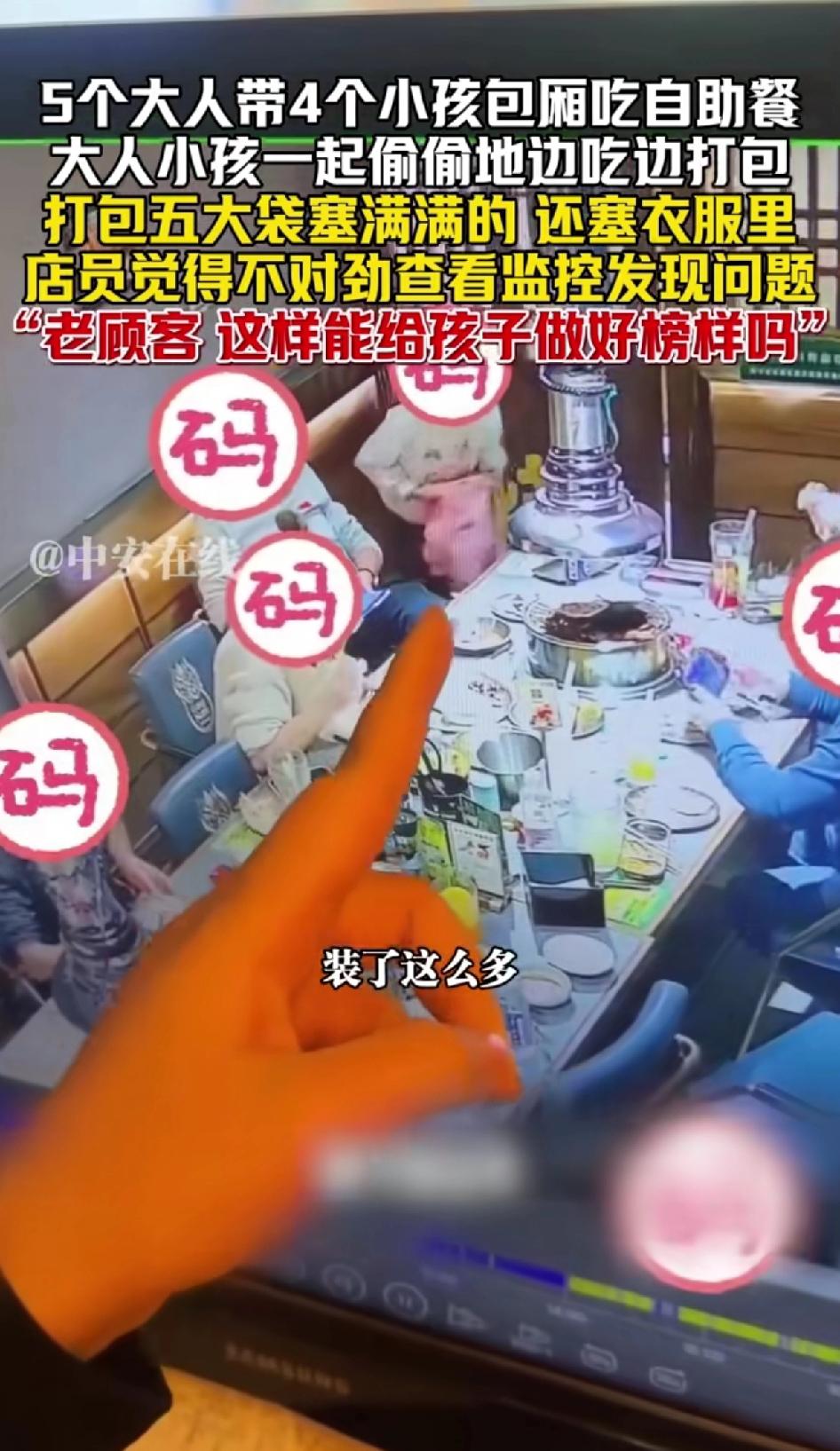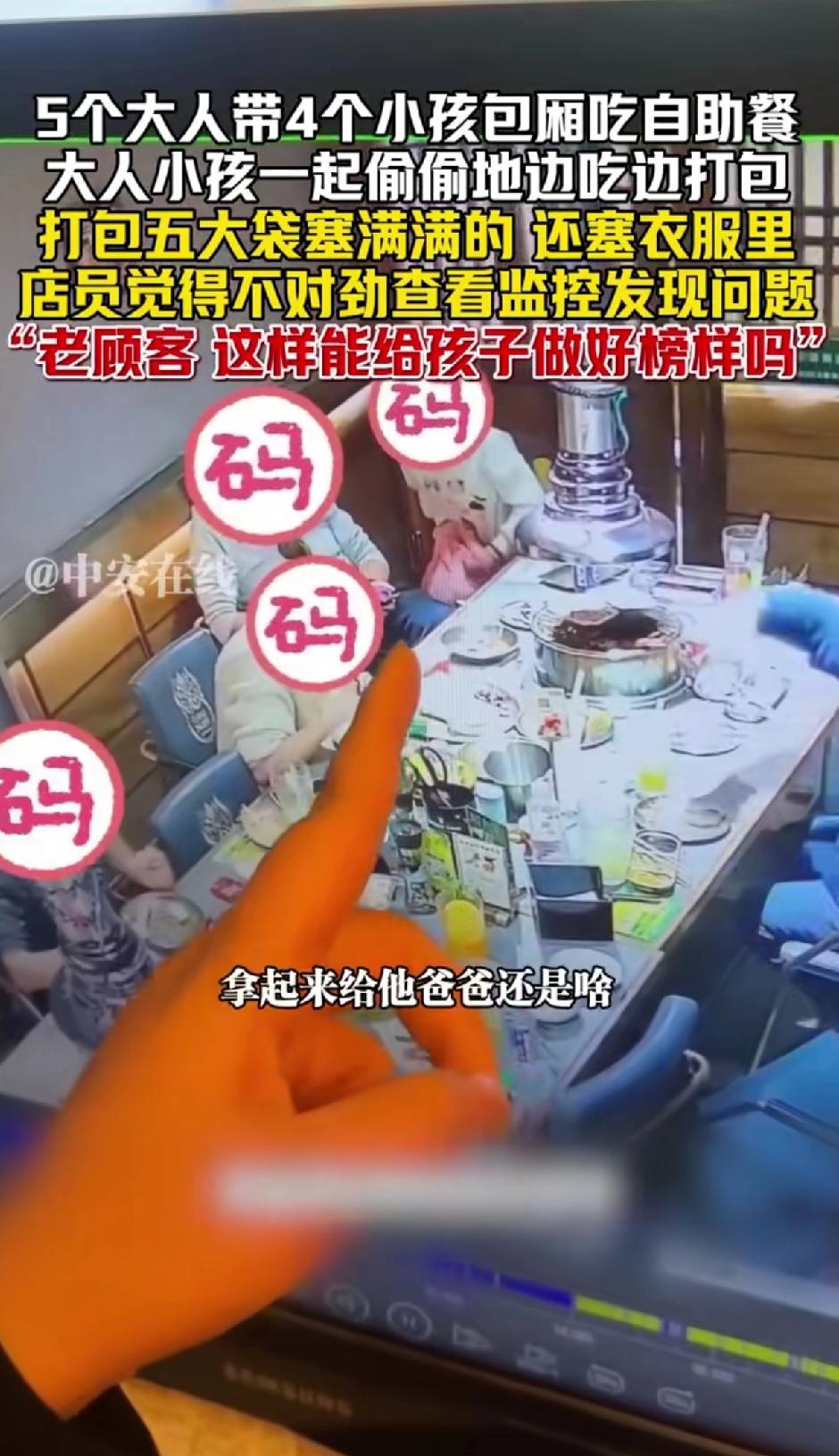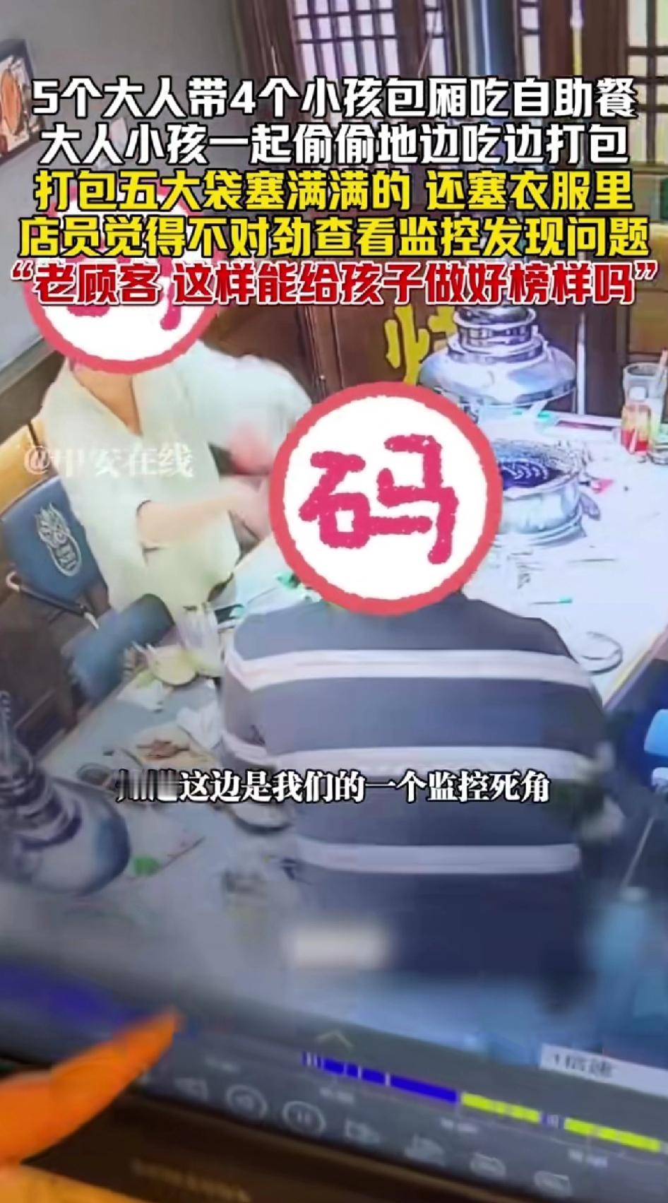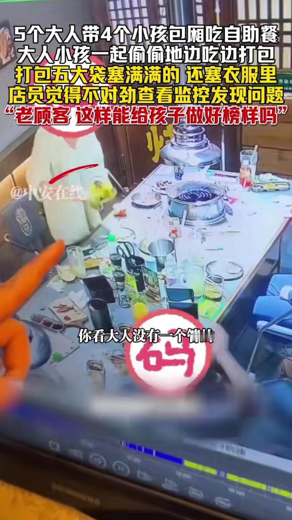 5个大人带4个小孩包厢吃自助餐,大人和小孩一起偷偷边吃边打包。 打包5大袋塞得满满的,还往衣服里塞,店员察觉不对劲查看监控发现问题。 让小孩参与打包,还专挑监控死角。老顾客5大4小,点了大量食物,像41份榴莲、22份三文鱼等,最后都打包带走。 老板:家长这样能给孩子做好榜样吗? 这些家长趁着来吃自助餐,趁机来进货的吧?真是活不起了,大人的言行举止,会直接影响到孩子。 难怪我穷,吃了那么多次自助餐,最多走的时候拿半瓶水,再加一颗薄荷糖。 用餐时从来没浪费过,虽然是自助餐,不能浪费食物,打包更是没有过。 视频里中5大4小这种行为既不遵守自助餐规则,又浪费食物,真不应该。
