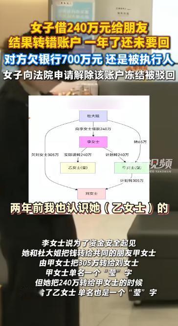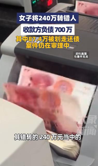 浙江一女子转240万给朋友,不料,朋友却说没收到!女子去核对记录,才发现自己竟然转错了人,她立马报警,没想到,警方也找不到对方,女子只能向法院起诉,结果,她转的一部分钱已经被法院“没收”了,理由是,对方居然是欠银行700万的被执行人!俗称“老赖”。 去年的时候林女士(化名)的朋友突然给她说急需要两百多万元救急一些,于林女士也没多想就直接转了过去,两百四十万不是小数目,她在手机银行上输完账号,特意看了看姓名,确认没问题才点了转账。 转完之后还给朋友说了一声钱已经到账了,注意看一下。 林女士一开始没慌,以为是银行到账延迟,做生意经常转账,偶尔慢一点也正常,她就没再多想,耐着性子等了几个小时,可眼看快天黑了,朋友还是说没收到,她心里慌了一下,赶紧查转账记录,这一看,魂都快吓飞了,钱确实转出去了,但收款人姓名,根本不是她的朋友,而是个完全陌生的人。 原来输账号时,不知道哪个数字输错了,转到了陌生人账户里,恰巧两人的名字最后一个字一样就这样转了过去。 林女士当场就慌了神,第一时间打银行电话,想让银行把钱拦截回来,可银行的回复让她心凉半截,转账已经成功到账,属于正常操作,没法直接撤回。 没办法,她只能报警,盼着警方能帮忙找到收款人,让对方把钱还回来,警方很快介入,顺着收款账户的信息往下查,可事情没那么简单,收款人始终没主动现身,能联系上对方的渠道少得可怜。 协商没用,警方协调也没进展,林女士眼睁睁看着自己的钱躺在别人账户里,却拿不回来,急得满嘴起泡,走投无路之下,她只能找律师,准备通过法律途径维权,把收款人告上了法院。 可开庭后,更让她崩溃的事情来了,法院调查收款人资产状况时发现,这个人竟然是个 “老赖”,早就因为拖欠银行七百万贷款,被列入了失信名单。 林女士转过去的两百四十万,一部分已经被法院依法划扣,用来偿还收款人之前的债务,剩下的钱也被冻结,纳入了执行财产范围。 林女士觉得自己只是操作失误,这笔钱理应全额返还给自己,现在,她已经提起了进一步诉讼,希望法院能明确这笔钱是误转款项,把钱还给她。 可案件还在审理中,最终能不能要回钱,还是个未知数。 这事传到网上,网友们都替林女士揪心,有人说,大额转账真的要小心,多核对几遍都不为过,一个数字错了,就是天大的麻烦,还有人分享自己的经验,转大额钱之前,先转试一下,确认对方收到了再转全款,能少很多风险。 对林女士来说,这 240 万不仅是巨大的经济压力,更是一堂沉重的课,好好的生意资金,就因为一个小小的操作失误,变成了说不清道不明的纠纷。 信息来源 :大象新闻