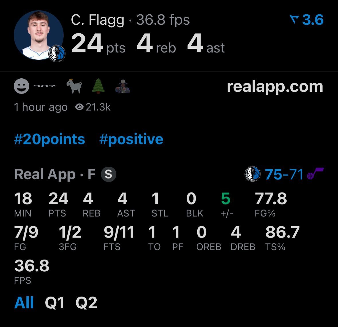 状元本色!弗拉格上半场出战18分钟,投篮9中7,三分2中1,罚球11中9,得到24分4篮板4助攻1抢断。