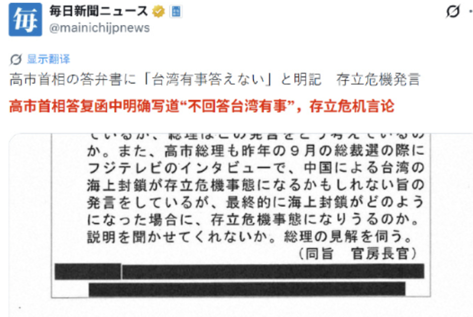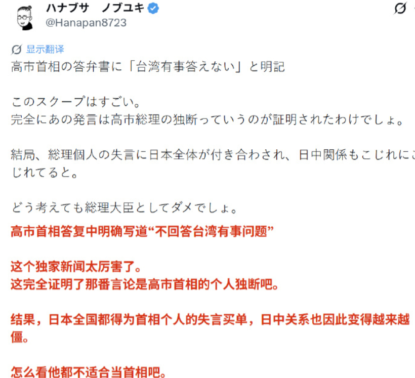 日本主流媒体纷纷曝光,称高市早苗闯祸的那句话,是她自己说漏了嘴!最近几天,日本多家主流媒体不约而同聚焦一个细节:11月7日国会答辩中,高市早苗那句引发争议的发言,并不是照本宣科,而是“即兴发挥”——也就是说,是她自己说漏了嘴。据报道,高市早苗当天面对的质询问题,其标准答案早已由官僚团队拟好。这份资料明确指示:“关于台海问题的假设性问题,不予回答。”换句话说,这不是一次开放讨论,而是一次需要严格遵循既有政策口径的例行答辩。但高市在实际发言中却偏离了脚本。看来啊,现在日本的媒体纷纷找台阶下,说高市的发言并非出自官方统一口径,而是她个人的主张。显然,这可能是日本内部希望找补回来双方的关系。毕竟,现在中方的一系列措施,让日本开始感到疼了。稀土进口受限了,水产品出口也没了,中方游客也不见了。不少日本人很不满,认为日本全国都在为高市早苗的一句话买单。而且这句话是头脑发热之下,脱口而出的。这样的人,怎么适合做首相呢?