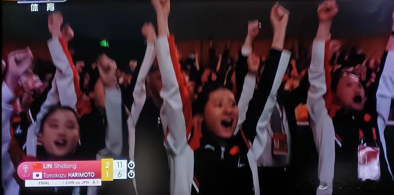瞧这一家子!第一张照片是两男三女,第二张照片是两女三男,都是陈熠领衔。她们在为莎莎和大头助威。爱国主义、集体主义永远是国乒的魂!