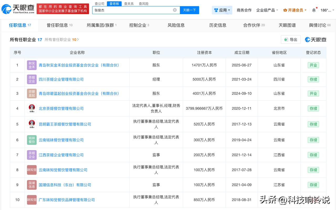 【盘点霸王茶姬创始人商业版图 霸王茶姬创始人名下关联十余家公司】霸王茶姬创始人婚礼人手一杯奶茶 霸王茶姬员工晒创始人喜糖 12月15日,霸王茶姬创始人张俊杰与光伏龙头天合光能创始人高纪凡之女高海纯举办婚礼。婚礼现场部分视频及图片流出,给宾客准备的饮品是大量霸王茶姬奶茶。 天眼查App显示,张俊杰名下关联十余家企业,其中9家为存续状态,包括北京茶姬餐饮管理有限公司、昆明霸王茶姬餐饮管理有限公司等,涉及投资、企业管理、餐饮等领域,张俊杰在上述企业担任法定代表人、董事长等职务。 天眼查信息:-c4076629618