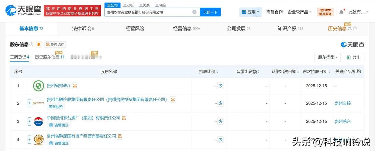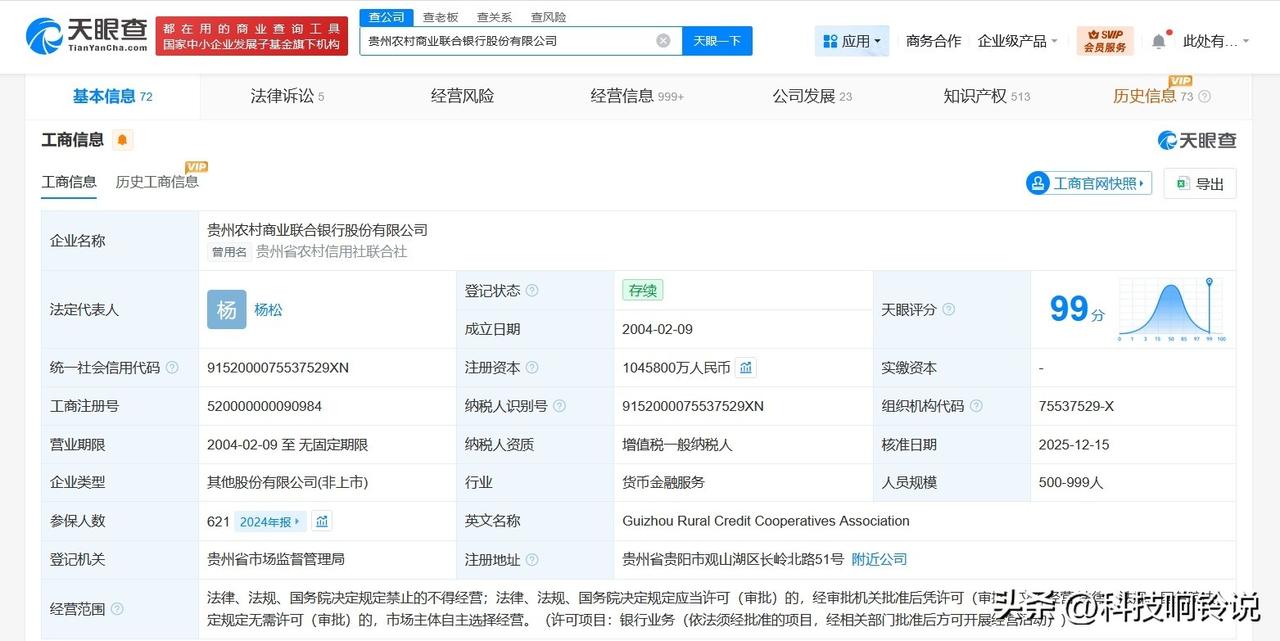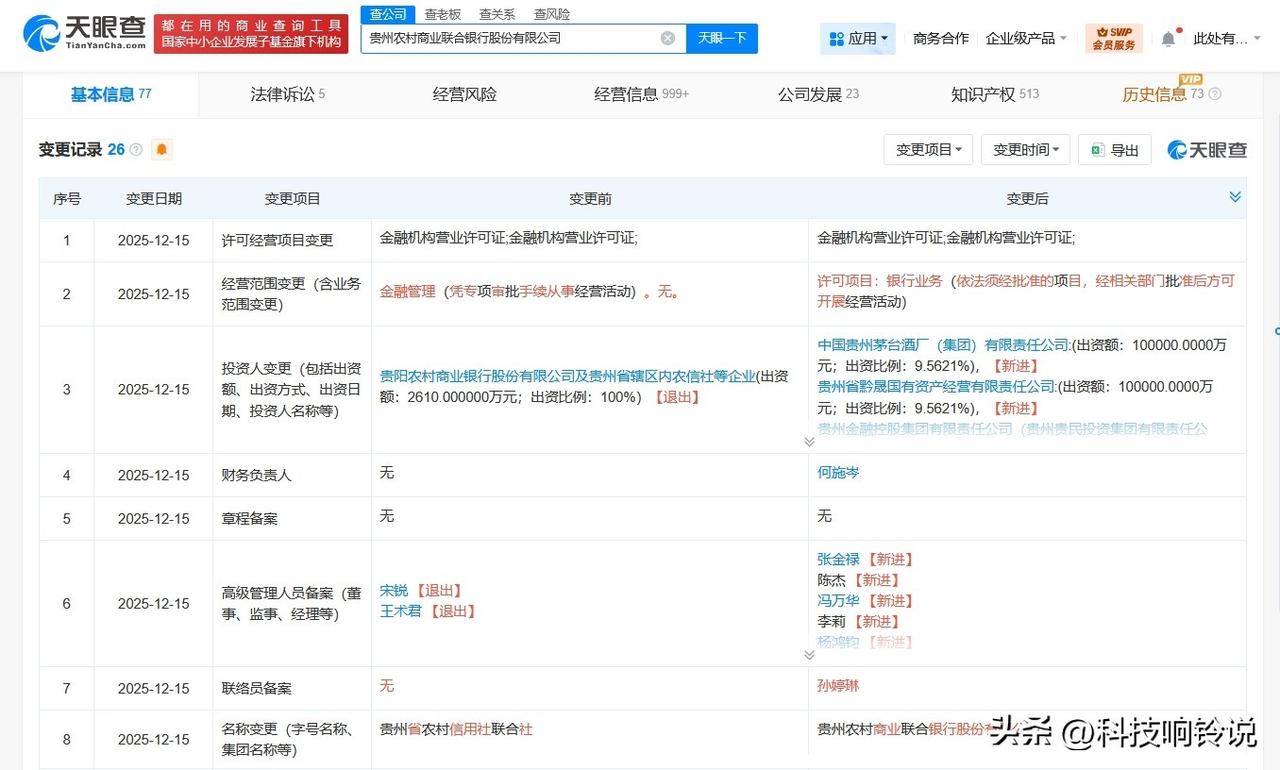 【贵州农商行组建完成工商变更 贵州省农村信用社联合社更名贵州农商行】 天眼查工商信息显示,近日,贵州省农村信用社联合社发生工商变更,企业名称变更为贵州农村商业联合银行股份有限公司,新增贵州金融控股集团有限责任公司(贵州贵民投资集团有限责任公司)、贵州省财政厅、贵州省黔晟国有资产经营有限责任公司、中国贵州茅台酒厂(集团)有限责任公司为股东,同时,注册资本由2610万人民币增至约104.6亿人民币。 贵州农村商业联合银行股份有限公司成立于2004年2月,法定代表人为杨松,经营范围为银行业务。 据媒体报道,12月15日,国家金融监督管理总局贵州监管局发布《关于贵州农村商业联合银行股份有限公司开业的批复》,同意贵州农村商业联合银行开业。业务范围包括办理或代理贵州农商银行系统的资金清算和结算业务;参加资金市场,为贵州农商银行系统融通资金;组织贵州农商银行系统的资金调剂;办理经金融监督管理部门批准的其他业务。 天眼查信息: