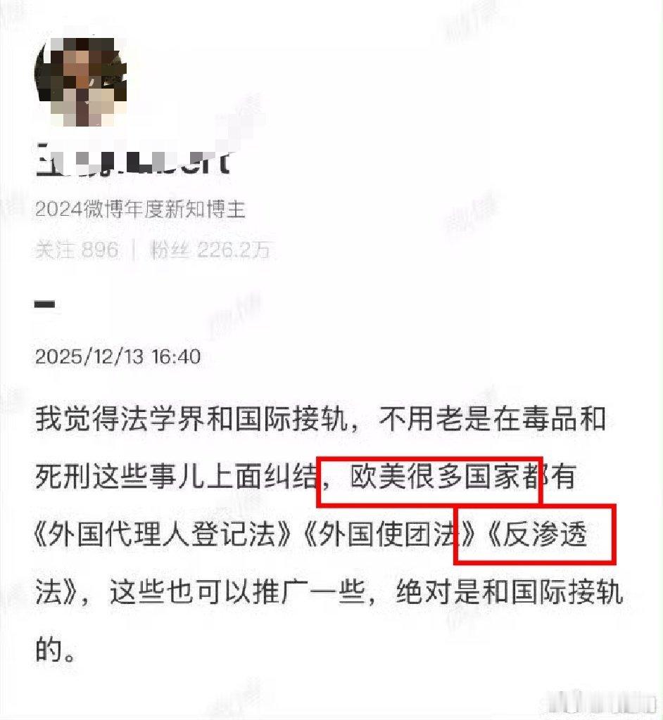 在立法问题上,我是小学生,甚至有时候连法律文本都看不明白,只是工匠,无意涉及这些高大上,门槛太高的法律问题。不过,有些法律常识还是略知一二。比如,这位网民说《反渗透法》是欧美国家的法律,呼吁我们立法与国际接轨。这句话犯了非常严重的政治错误。因为《反渗透法》是台独当局拒统的“省内”、“岛内”闹剧,把台湾称为国家是极其伤害中国人民感情的错误表达。《外国使团法》是美国30年代冷战时期的一部法律,它是行政权的延伸器,其核心是对抗。很多国家有类似“外国人代理法”。如中国要制定相关的法律,需要关注,如何界定“外国代理人”和“政治活动”的范围,设置外交活动、纯粹商业活动等豁免条款,平衡好国家安全与正常国际交流的关系等方面内容。所以呢,法律是门非常严肃的科学,尤其是立法工作。因此,与国际接轨要充分考虑我们的国情,对于外国的法律不能有拿来主义的想法,要有扬弃的辩证思想,因为这涉及主权和尊严。