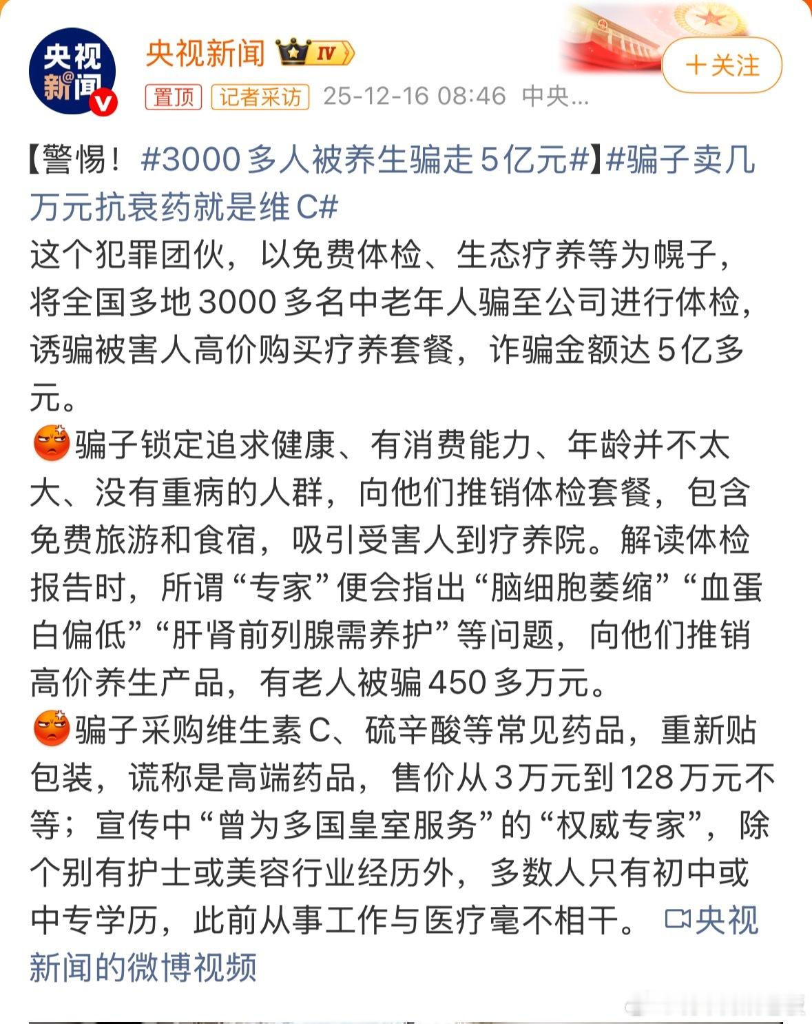 3000多人被养生骗走5亿元触目惊心!3000位老人被“天价疗养”骗走5.3亿,所谓“干细胞神药”竟是换包装的维C,专家多是初中学历的骗子。免费体检+夸大病情制造焦虑,用“充值送翻倍”“高端疗养”画饼,保健品不能替代药品,“根治”全是谎言!一定要守护好长辈的钱袋子,陌生专家不要信、免费福利不要贪,快转发给家人,一起筑牢防诈墙!