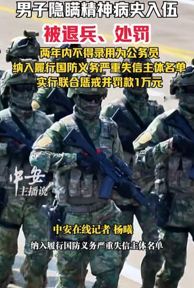 江西一男子报名参军,体检、政审都很顺利,结果,进入部队后,却被查出有“前科”,原来,男子此前曾入过一次伍,新兵训练期间出现精神障碍,被鉴定为分离转换性障碍,不对将男子退回原籍,这次男子隐瞒病情参军,不仅要被退兵,而且还将遭受严厉处罚! 24岁的夏某某,大概是把“军营梦”当成了“闯关游戏”——以为瞒过体检医生,就能通关入伍,却没想到全国征兵系统是“终极BOSS”,直接让他的“开挂人生”原地翻车! 故事要从2024年的“初闯军营”说起。 当时还是大学生的夏某某,凭着一腔热血报名参军,一路过关斩将通过审核,顺利穿上迷彩服,被派往安徽某新兵训练基地。 本以为是“逆袭剧本”的开始,结果集训没几天,他突然精神异常,部队赶紧送医检查,最后确诊“分离(转换)性障碍”。 这病显然不符合服役要求,夏某某刚焐热的军装还没穿顺,就被按规定退回原籍,更关键的是:全国征兵信息系统里,给他记了个“终身禁止再次入伍”的“永久黑名单”。 可夏某某的“军营执念”太深,硬是把“黑名单”当成了“过期优惠券”。 他琢磨着:“只要我不说,谁能知道我去过?” 2025年9月征兵通道一开启,他立马再次报名。 体检时,面对“是否有精神疾病史”的灵魂拷问,他眼不眨心不跳选了“无”。 医生追问“之前是不是参过军”,他还耍起了文字游戏:“就报过名,没去成”。 靠着这套“影帝级”演技,他居然又蒙混过关,再次穿上了心心念念的军装,差点以为自己“瞒天过海”成功了。 然而,现实很快给了他一记响亮的耳光。 刚到部队没几天,战友们都在兴冲冲办军人保障卡,轮到夏某某时,系统突然弹出红色预警——“该人员存在禁止入伍记录!” 录入流程直接卡死,工作人员当场就觉得不对劲,赶紧启动跨地区核查。 这不查不知道,一查吓一跳:原来这小伙子是“二进宫”,还带着“病史黑记录”! 结果可想而知,夏某某刚穿上的军装还没捂热,就被当场退兵,灰溜溜地回了家。 更惨的还在后面:湖口县征兵办直接亮出“处罚大礼包”。 罚款1万元,两年内不准考公务员、进国企事业单位,不准出境,连升学复学都被禁止,还被拉进了“国防义务严重失信名单”。 原本想圆军营梦,结果把自己的人生档案弄得“一身污点”,真是偷鸡不成蚀把米,赔了夫人又折兵。 其实这种“追梦翻车”的案例,早就不是新鲜事了:有人隐瞒重度哮喘入伍,跑到高原拉练时突然窒息,差点出大事。 还有人瞒着扁平足病史,结果长时间行军把脚磨得血肉模糊,最后还是被退兵。 说白了,参军不是“过家家”,每一道审核程序都不是摆设——既要看你身体好不好,更要看你诚信不诚信。 部队要的是能扛事、守规矩的战士,不是耍小聪明、弄虚作假的“演员”。 夏某某的经历也算给所有想参军的年轻人提了个醒:军营梦很美好,但诚信才是敲门砖。 别想着钻空子、耍花招,系统不会漏记,规矩不会留情,任何“瞒天过海”的操作,最终只会让自己“自食恶果”! 对于此类事件,网上的网友是这样评价的,笑不活了!把全国征兵系统当摆设,这小伙是真敢赌啊! 以为装装样子就能蒙混过关,殊不知现在信息都是全国联网的,之前的退兵记录早留底了,办保障卡那步纯属自投罗网,1 万元罚款 + 失信记录,这波血亏不亏? 还有的网友表示,理解想参军的心情,但也不能拿规矩当儿戏啊!精神类疾病本来就不适合部队高强度训练,隐瞒病史不仅是对自己不负责任,也是对战友不负责,真要是训练时发病,后果不堪设想,处罚一点不冤。 也有的网友嘲讽,这操作也太天真了,以为 “不说就没人知道”?征兵审核一道接一道,最后还有系统兜底,根本没漏洞可钻。 现在好了,军营梦没圆成,还留下终身失信污点,考公、升学都受影响,简直是捡芝麻丢西瓜。 那么到最后,你们是怎么看的呢? 如果各位看官老爷们已经选择阅读了此文,麻烦您点一下关注,既方便您进行讨论和分享,又能带来不一样的参与感,感谢各位看官老爷们的支持!
