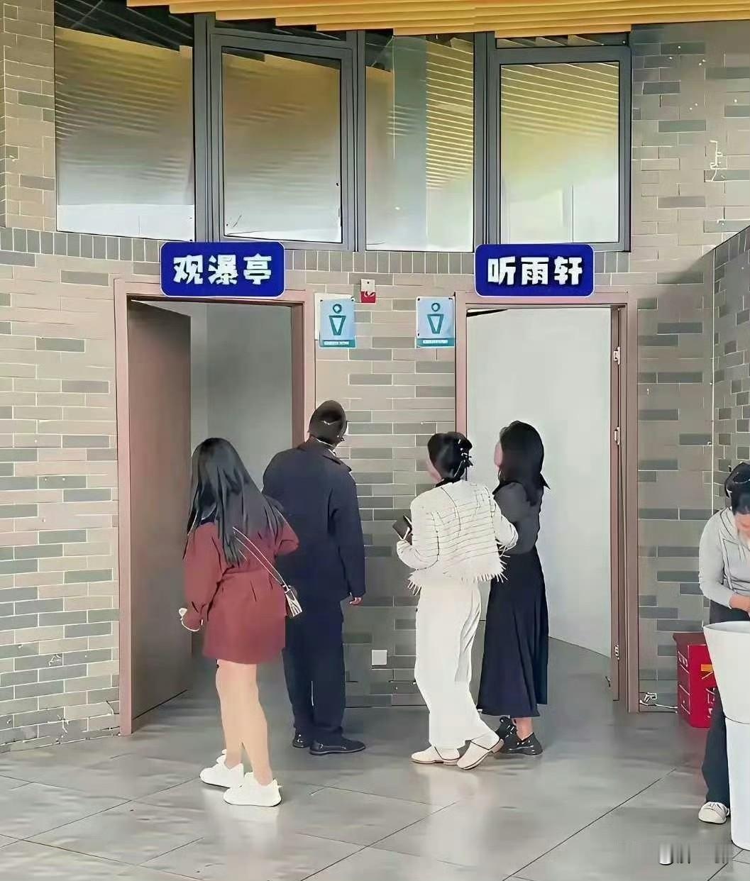 这该怎么选?你能看的懂吗?如果走错了可不可以甩锅给提示牌? 看到这个公共厕所的指示牌,一开始真的有点懵了!“观瀑亭、听雨轩”后来仔细琢磨一下,男人应该是“听雨轩”! “听雨轩”我没想太明白,但是“观瀑亭”好像有点形象! 所以我判断女左男右!