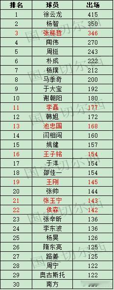 【赛季数据总结-出场(球员篇)】 2025赛季国安共有27名球员在联赛出场,同2024赛季一样。古加和法比奥同为全队最多,30场全部出场。国内球员出场最多的是曹永竞,28场,塞尔吉尼奥和张玉宁各27场。 在球队联赛历史出场榜中,现在阵中球员出场最多的是张稀哲,共出场346场(本赛季出场17场),位列第三位,落后杨智(350场)和徐云龙(415场)。李磊本赛季出场16场,历史共出场177场,排在第11位,落后第10位的谢朝阳10场。现在阵中球员排在前30位的,还有池忠国(168场),排在第13位。王子铭(154场)排在第16位。王刚(145场)排在第19位。张玉宁(143场)和侯森(142场)排在第21位和第22位。