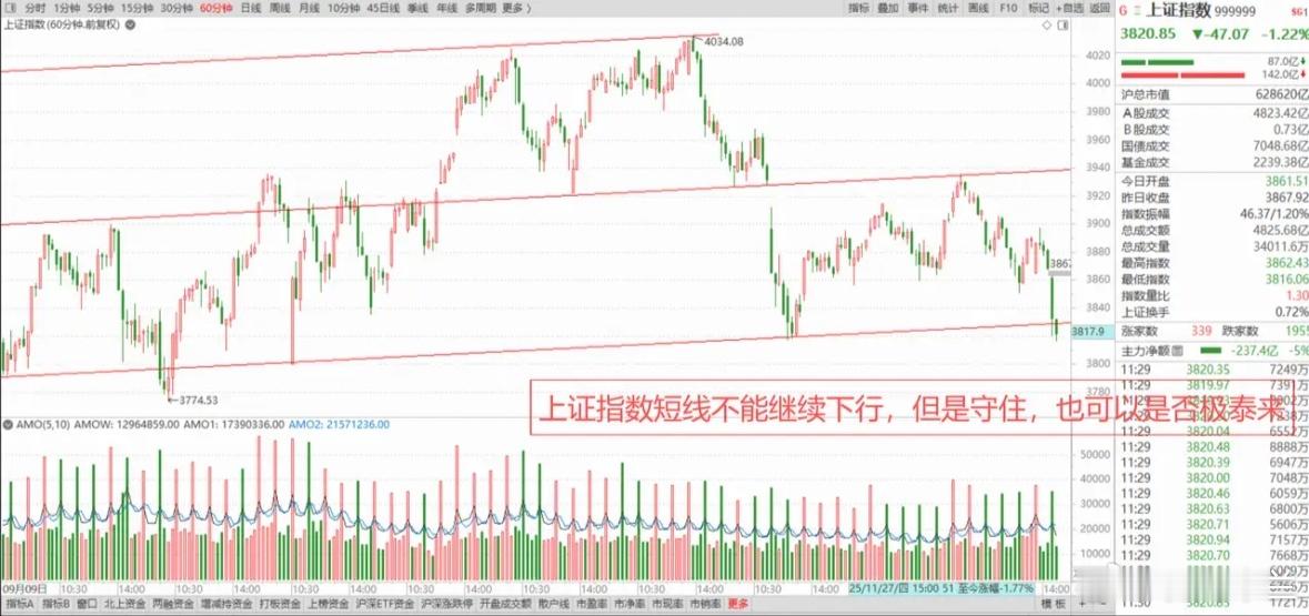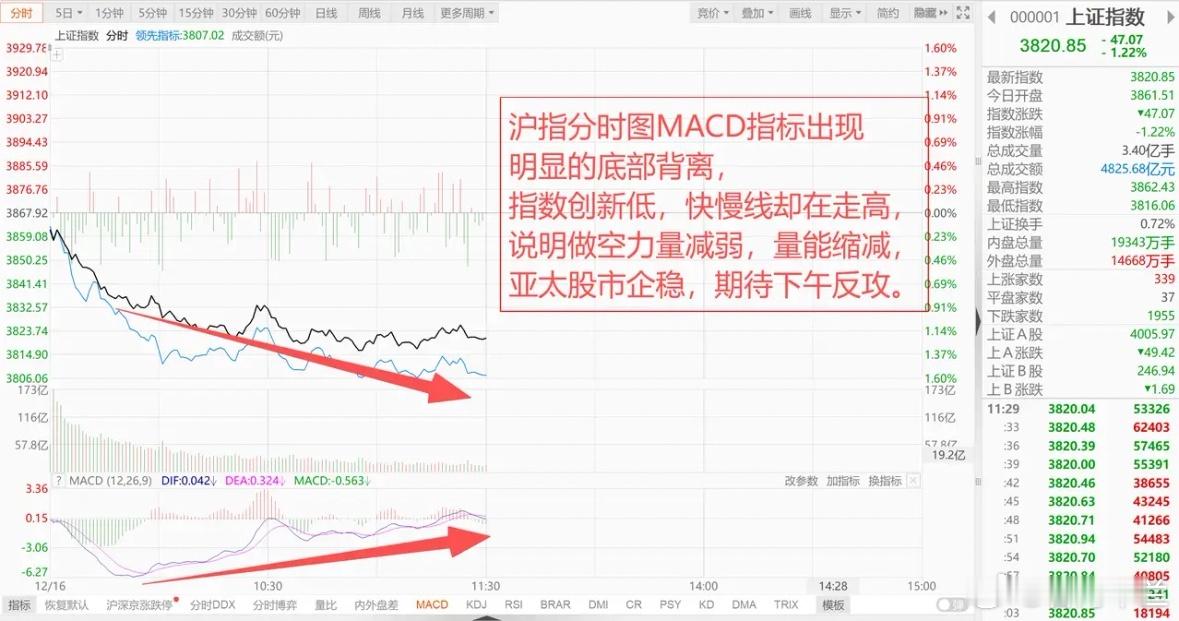 亚太股市跳水,A股港股跟跌,上证指数创阶段新低,能守住关键位吗? 1、美股高开低走 上周五美股收盘大跌,科技股在OpenAI的影响之下领跌,市场再度担心AI科技股泡沫,高投入数据中心,影响企业的盈利。周一美股本来止跌回稳,盘前股指期货上涨,三大指数纷纷跳空高开,可惜最终同步走低,一起收跌。纳指原本跳空高开0.58%,收盘下跌0.59%。 2、亚太股市跳水 上午日本股市开盘就直接跳水了,后续不仅没有企稳,反而震荡走低,日经225指数北京时间午间11:35分盘中跌幅达1.6%。韩国股市也是跳空低开震荡走低,同样在11:35分,指数跌幅达1.95%。澳大利亚股市上午上涨,午后同样跳水下行,但是跌幅仅在0.57%。 3、港股大跌,恒生科技跌破年线 昨夜美股中概股走弱,纳斯达克中国金龙指数大跌2.17%,港股恒生指数在中概股和亚太股市的影响之下,直接破位了半年线,早盘跳空低开0.32%以后,震荡下行,午间收盘大跌1.91%;科技股受影响更加明显,恒生科技指数大跌2.41%,午间跌破年线,跌到了下行趋势的关键支撑位上。 4、A股沪指大跌,盘中创11月21日新低 A股上证指数低开0.17%以后,也是一路震荡下行,盘中没有正经反攻,午间收盘大跌1.22%,收在3820点。盘中低点3816.06点,创了11月21日3816.58点的新低,目前这个位置不能继续下行了,否则上证指数就会脱离盘整区间,进入下行通道。 5、技术指标也是到关键位置 下午的走势就很关键了,如果继续下跌破位,那下方的空间就被打开了,同时,反过来,只要这里企稳,又是否极泰来的时刻。其一、日韩股市已经企稳了,起码没继续下行;其二,沪指分时图的MACD指标,出现了底部背离的现象,下午也有可能反攻;其三,目前没有利空事件的影响,美股下跌说白了跟我们也没啥关系。 综上所述,我仍然认为,岁末年初还是有一轮春季躁动行情,俗称跨年行情。昨天收评专门讲到,跨年行情到来之前,也常规有一个杀跌深蹲然后起跳的过程,每每拉升之前,大概率先杀一波。况且今天上午的下跌是一个缩量下跌,没有多少筹码恐慌出逃,比昨天上午还要缩量606亿,上午仅成交1.12万亿! 期待下午的大反攻!
