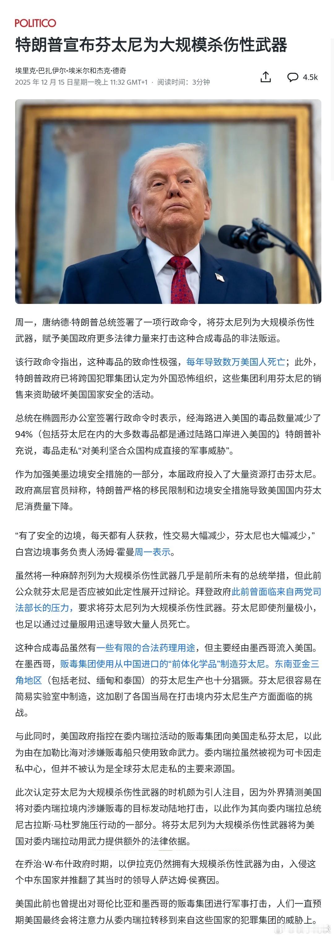 【特朗普宣布芬太尼为“大规模杀伤性武器”】[还是美国会造词儿,凡事皆可“武器”。问题在美国境内市场决定]