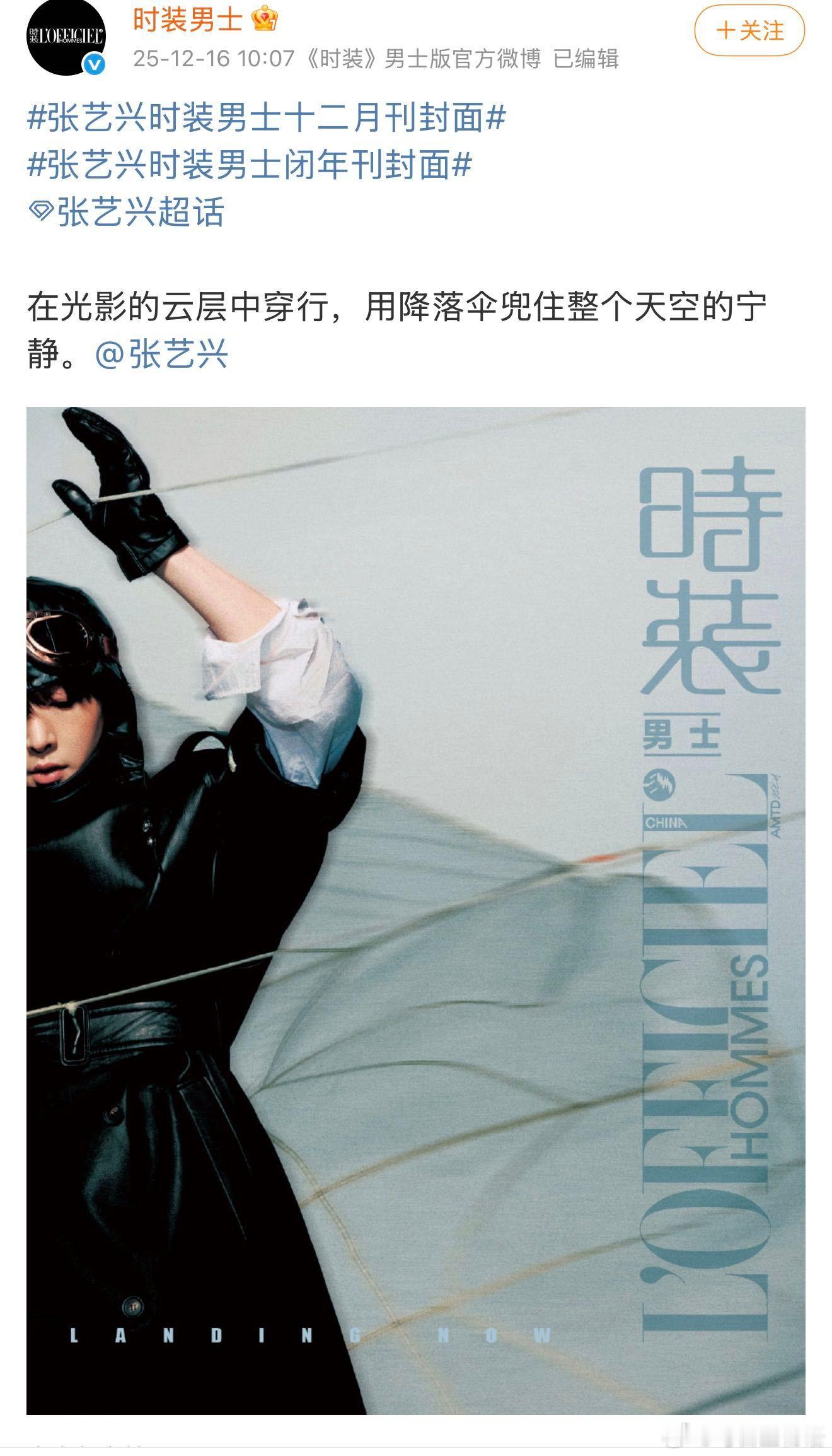 张艺兴时装男士十二月刊封面 又来了!张艺兴与《时装男士》第四次合作达成,强势锁定2025年度收官封面!预告中飞行造型氛围感十足,神秘又高级!期待正片!