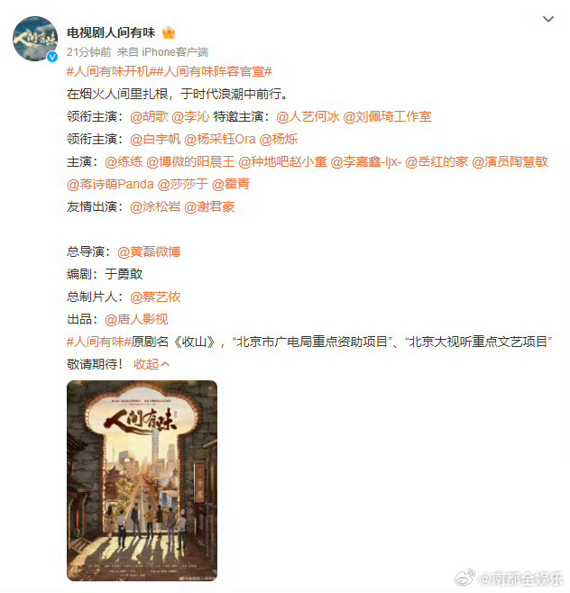 人间有味开机黄磊是胡歌李沁新剧总导演 今日,《人间有味》官宣开机。开机信息显示,黄磊是该剧总导演,胡歌、李沁领衔主演。这阵容,期待!