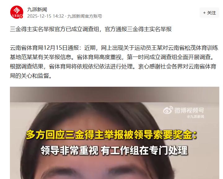 三金得主实名举报官方已成立调查组,官方通报三金得主实名举报 云南省体育局12月15日通报:近期,网上出现关于运动员王某对云南省松茂体育训练基地范某某有关举报信息。省体育局高度重视,第一时间成立调查组全面开展调查。根据调查结果,省体育局将依规依纪依法进行处理。衷心感谢社会各界对云南省体育局的关心和监督。 刷到亚运冠军王莉的举报视频时,很难不跟着揪心,这个2002年出生的壮族姑娘,2023年在杭州亚运会上一口气拿下女子龙舟200米、500米、1000米三枚金牌,成了云南首位亚运三金得主,当时她把金牌全挂在基地主任范继文脖子上致谢的画面还历历在目。 可谁能想到,这份荣耀成了噩梦的开端。 王莉在视频里说,载誉归来后,范继文直接要走国家发的15万奖金,她把银行卡交给父母保管,没法答应,当场就被骂“愚孝”。 说白了,这拒绝像捅了马蜂窝,公开会议上她被批“不知感恩”,训练资格直接被取消,更狠的是,自己还蒙在鼓里,退役材料就被悄悄报上去了。 她哭着求过,说还想为国争光,可范继文转头就跟上级说她有伤练不了,彻底断了她的参赛路。 长期被这么打压,王莉患上了重度抑郁,好几次都濒临崩溃。 更让人发毛的是,她还曝出来队内早有体罚乱象:有人头撞破缝针,有人没写训练日记就被罚跪,照片还被发到家长群里羞辱。 范继文甚至当众说“你们的饭碗是我给的,我能收回一切”,这话里的嚣张劲儿真让人冒火。 12月15号,云南省体育局终于发了通报,说成立了调查组要彻查。 现在王莉还没正式退役,退役申请刚到基地这一步,没报给省里。 放到国际上看,这事更闹心,国际体坛最讲究运动员权益保障,像奥运会、亚运会的奖金分配都有明确规矩,国家体育总局早就说了奖金主要归运动员,领导没资格私要。 要是真像王莉说的这样,不光寒了运动员的心,外界还会觉得咱们体育系统的监督有漏洞。 别的国家看在眼里,说不定会质疑咱们竞技体育的公平性,这对以后国际赛事交流可不是小事。 体育圈的干净太重要了,运动员拿金牌靠的是日复一日的苦训,不是给人送礼的筹码。 现在大家都盯着调查组的结果,不光要查范继文有没有索贿、撒谎,那些体罚的事也得一五一十弄清楚。 毕竟谁也不想看到,为国争光的英雄流血之后,还要为尊严流泪。 以上都是个人观点,对此您有什么不同的看法,可以在评论区留言讨论!!!