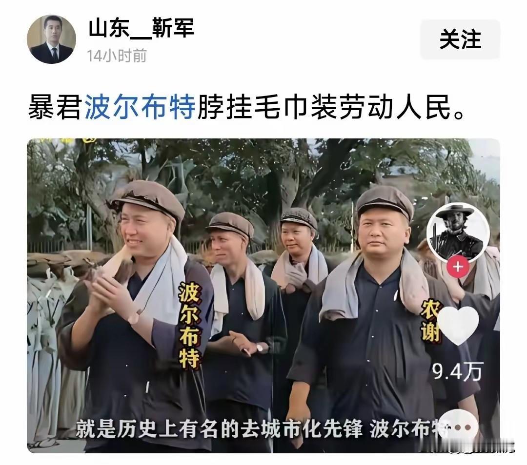 这个波尔布特看着和蔼慈祥 穿着黑布衣,围着白毛巾 殊不知他却是人类历史上 杀人如麻的恶魔[发怒]