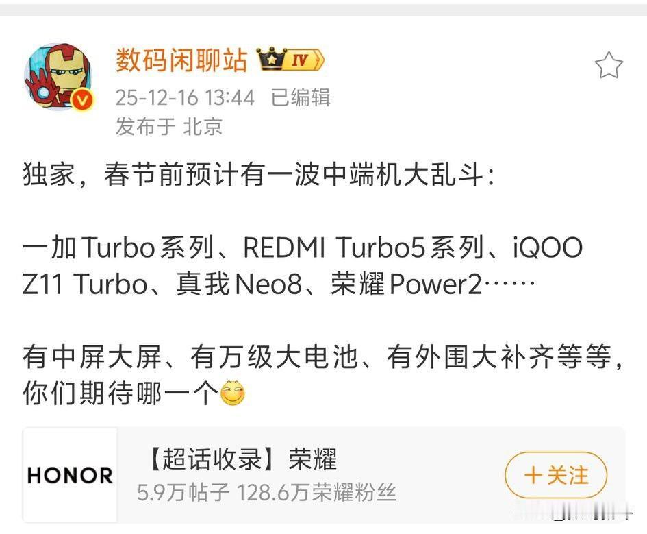 下个月各家turbo新机发布!真就是turbo大战了[泪奔]一加turbo机型命名turbo6?直接压红米turbo5一头,还有iQOO的Z11turbo系列,高配搭载骁龙8G5处理器,还有真我Neo8系列和荣耀power2机型,电池容量从七千多到一万毫安都有,处理器从天玑8500-骁龙8G5[奸笑]看看有几款机型是1开头的?