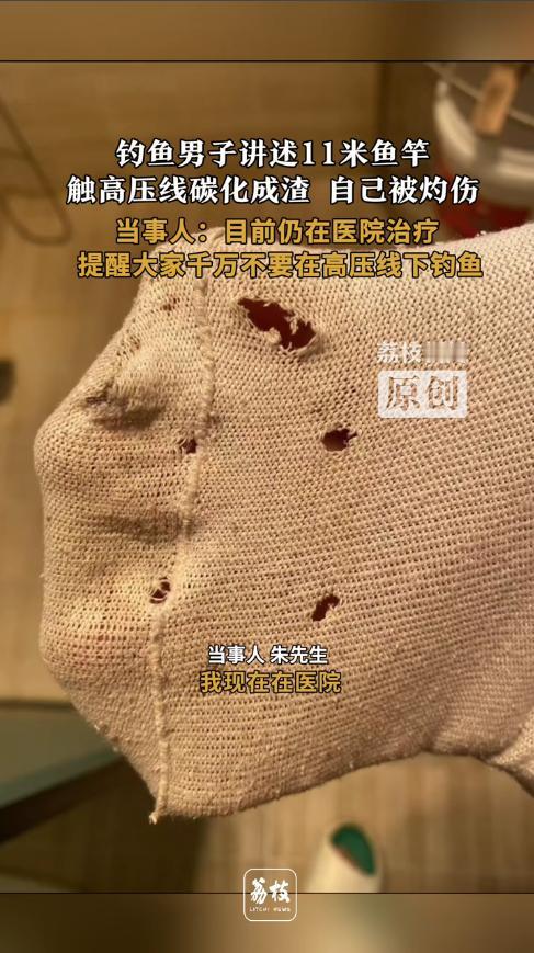 “命真大啊!”12月15日,安徽马鞍山,一男子在河边钓鱼时,鱼竿不小心碰到了高压电线!鱼竿瞬间被烧焦碳化,男子被震趴在地,左胳膊就像被开水烫了一样,疼得厉害,手套和袜子也被电出好几个洞。网友:捡了条命回来! 现在人们的休闲方式越来越丰富,不少人都喜欢钓鱼的那种刺激感,和未知生物“大战一场”后的喜悦,真的令人上瘾。但钓鱼时一定要选在开阔的地带,还要注意周围有没有电线。 事发当天天气晴朗,朱先生难得有时间,于是便带上装备,开车来到河边钓鱼。由于河边的水较浅,朱先生特地选了一根11米长的鱼竿,这样就能钓到更远的地方。 朱先生陆陆续续的钓上来了几条小鱼,但是他并不满足,打算将鱼钩抛到更远的地方试试,结果甩鱼竿的时候,不小心碰到了头顶的高压电线! 一瞬间,巨大的电流顺着鱼竿传导下来,朱先生整个人都被震趴在地,他只感觉左胳膊传来剧痛,仿佛被放在开水里烫了一遍。 等到他缓过来劲时,发现鱼竿都已经电成渣了,自己的两根手指也被严重烫伤,就连袜子都被电坏了! 随后,朱先生挣扎着赶往医院,目前还在治疗中。 大家一定要记住,千万不能在高压电线下面钓鱼,类似的意外不在少数,但是能侥幸活下来的却没有几个,朱先生无疑是幸运的! 信息来源:《钓鱼佬称鱼竿触高压线碳化自己被灼伤 当事人:目前仍在医院治疗 提醒大家千万不要在高压线下钓鱼》荔枝新闻