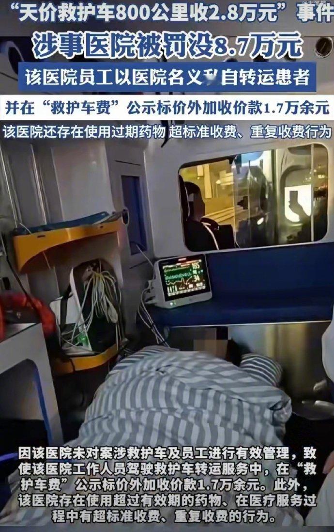 【天价救护车涉事医院被罚没8.7万】据@大河报 ,近日记者了解到,南昌赣医医院有限公司因生产、销售劣药行为,被南昌市市场监督管理局罚款6.1万余元,没收2.6万余元。 处罚事由显示,该医院员工以该医院名义私自转运江西省儿童医院患者唐某某至上海市内医院急诊,全程往返路程为1600公里,转运业务收取该患者转运费2.8万元,因该医院未对案涉救护车及员工进行有效管理,致使该医院工作人员驾驶救护车转运服务中,在“救护车费”公示标价外加收价款1.7万余元。此外,该医院存在使用超过有效期的药物、在医疗服务过程中有超标准收费、重复收费的行为。 今年6月,“从江西省儿童医院转运至上海某医院,800公里路程被收2.8万元”的消息引发热议。对此,江西省卫健委发布通报表示,经调查发现,救护车所有方南昌赣医医院存在收费不合理等问题。目前,卫生健康行政部门已责令其退回了不合理收费,并暂停医疗转运服务。