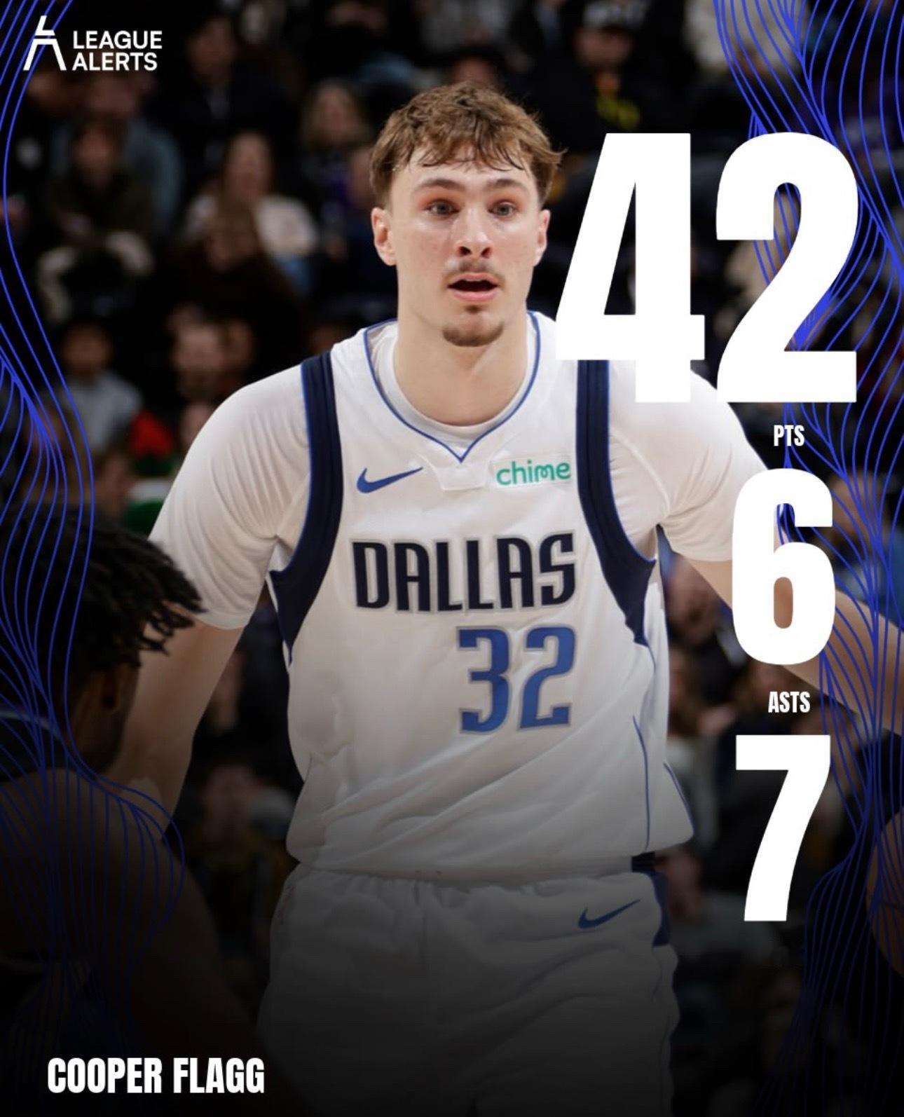 超越詹姆斯!弗拉格空砍42分,成为NBA历史上首位在18岁砍下40+的球员。此前18岁球员的得分纪录是詹姆斯的37分。弗拉格42分