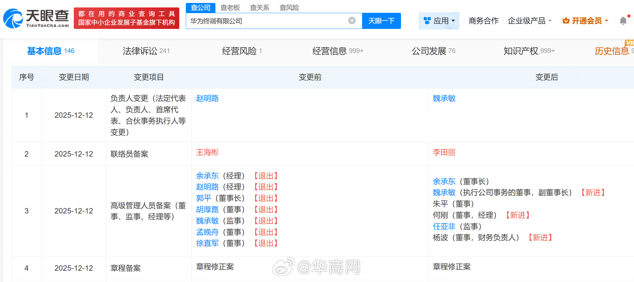 #余承东升职#【华为终端公司发生工商变更,余承东任董事长】每经AI快讯,天眼查工商信息显示,12月12日,华为终端有限公司发生工商变更,郭平卸任董事长,由余承东接任,孟晚舟、徐直军等卸任董事,同时,多位高管发生变更。(每日经济新闻)