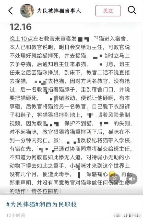 在社会上直不起腰来,就在学生身上找存在感。这种就是纯粹的失败者,让他不能在这个行业立足都是轻的,真的是让人恶心! 湖南湘西某职校查寝时的一幕,看得人脊背发凉!一名“教官”发现学生违规养宠后,不仅当着众人面两次重摔幼猫致其惨死,还公然谎称“猫主人同意摔死”,试图掩盖施暴行径,其私人社交动态中更毫无愧疚,直言“纵千夫所指,吾何惧之”,嚣张态度令人发指。 事件本有和平解决的可能:学生已诚恳认错,承诺次日将幼猫交由班主任妥善安置,班主任也到场同意接手。可仅因幼猫受惊躲入床底,这名工作人员便情绪失控,挣脱阻拦捉出小猫,脱衣示威般两次猛摔地面,直至幼猫失去生命迹象被扔进垃圾桶。学生情急下的争执气话,竟成了他施暴的借口,所谓“主人同意”纯属无稽之谈,全程都是其滥用权力的暴力宣泄。 学生违规养宠可依规处罚,但无辜幼猫绝非泄愤工具。作为校园管理者,无论其是正式教官还是临时协管,本该传递规则与善意,却用极端残忍的方式漠视生命,给在场学生造成难以磨灭的心理阴影,完全违背了教育的本质。更值得追问的是,如此情绪失控、毫无同理心的人,为何能进入校园参与管理?当地教体局虽已介入调查,但公众期待的不仅是对涉事者的处罚,更要查清学校人员聘用漏洞,杜绝此类暴力事件再次发生。 生命不分贵贱,规则的执行更不能背离人性底线。这样的“管理者”必须被彻底清除出校园,唯有守住对生命的敬畏,才能守护校园应有的温度。 教官摔死猫并称主人同意的